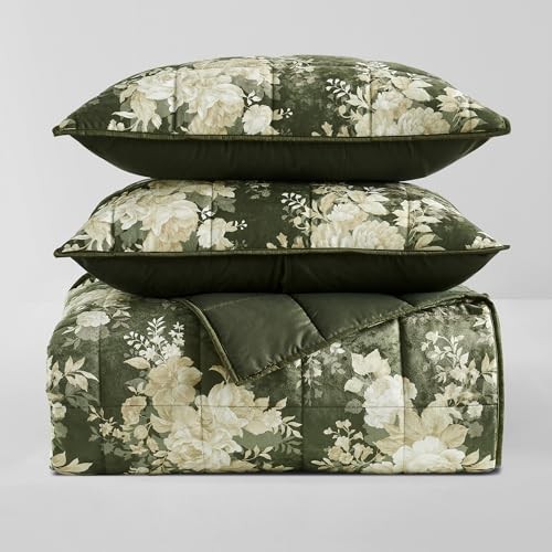 Luxury Velvet Quilt Set with Elegant Floral Printed,Quilt Set Queen C-green