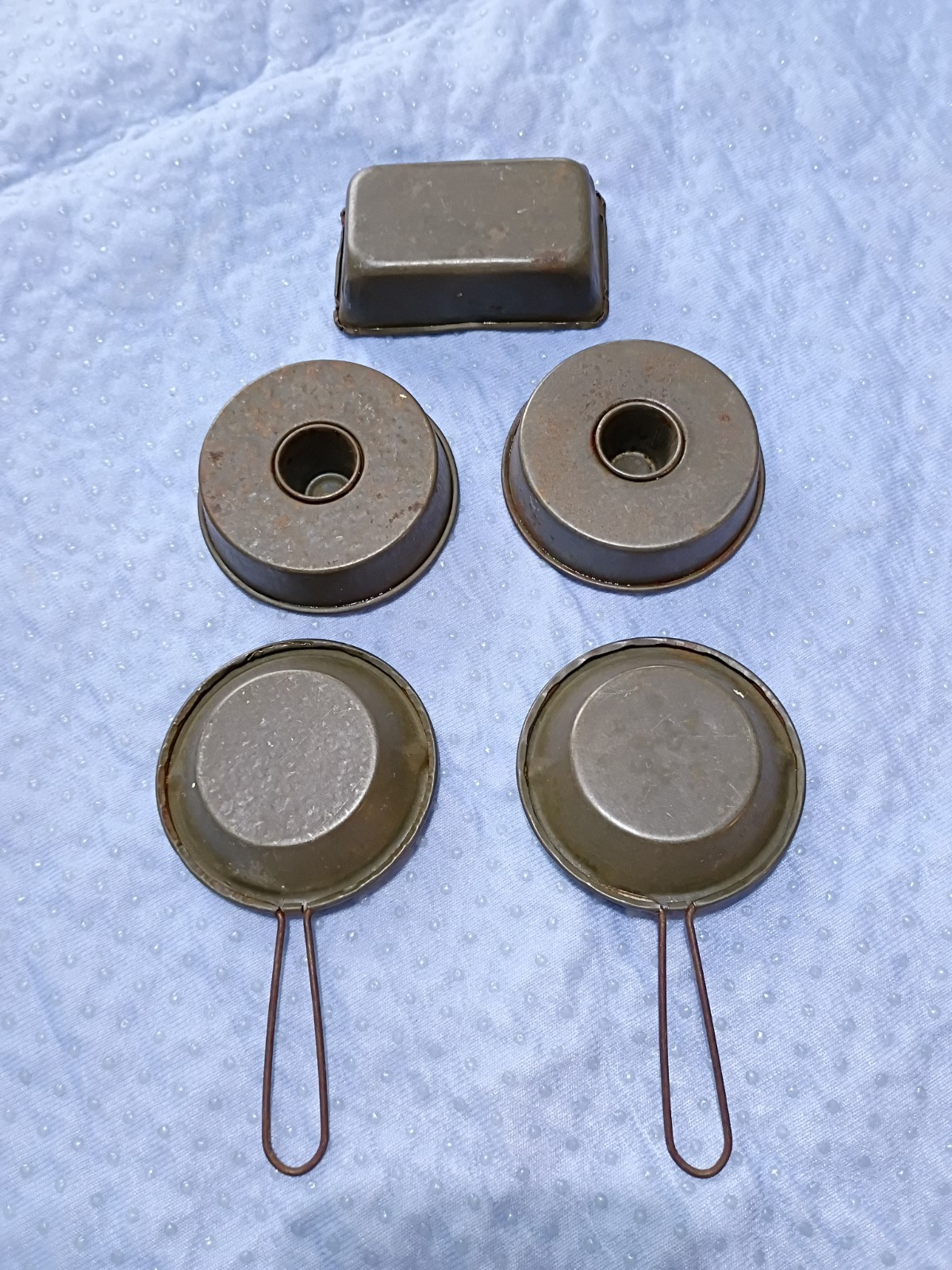 как выглядит Vintage Miniature Metal/Tin Toy Kitchen Pans and Bakeware Set, Lot of 5 фото