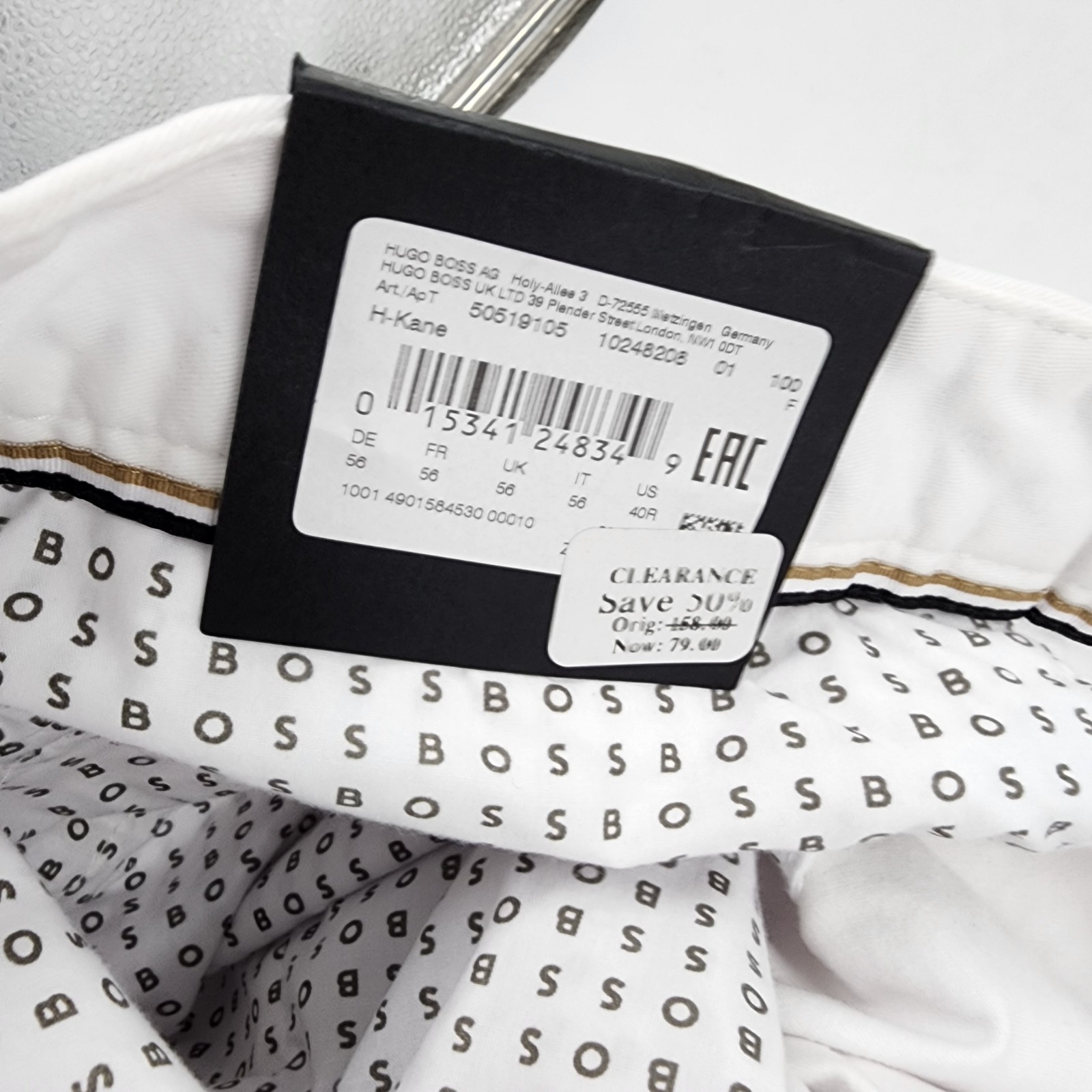 BOSS Kane Regular Tapered Fit Pants Men's White Zip Fly with Button 40R