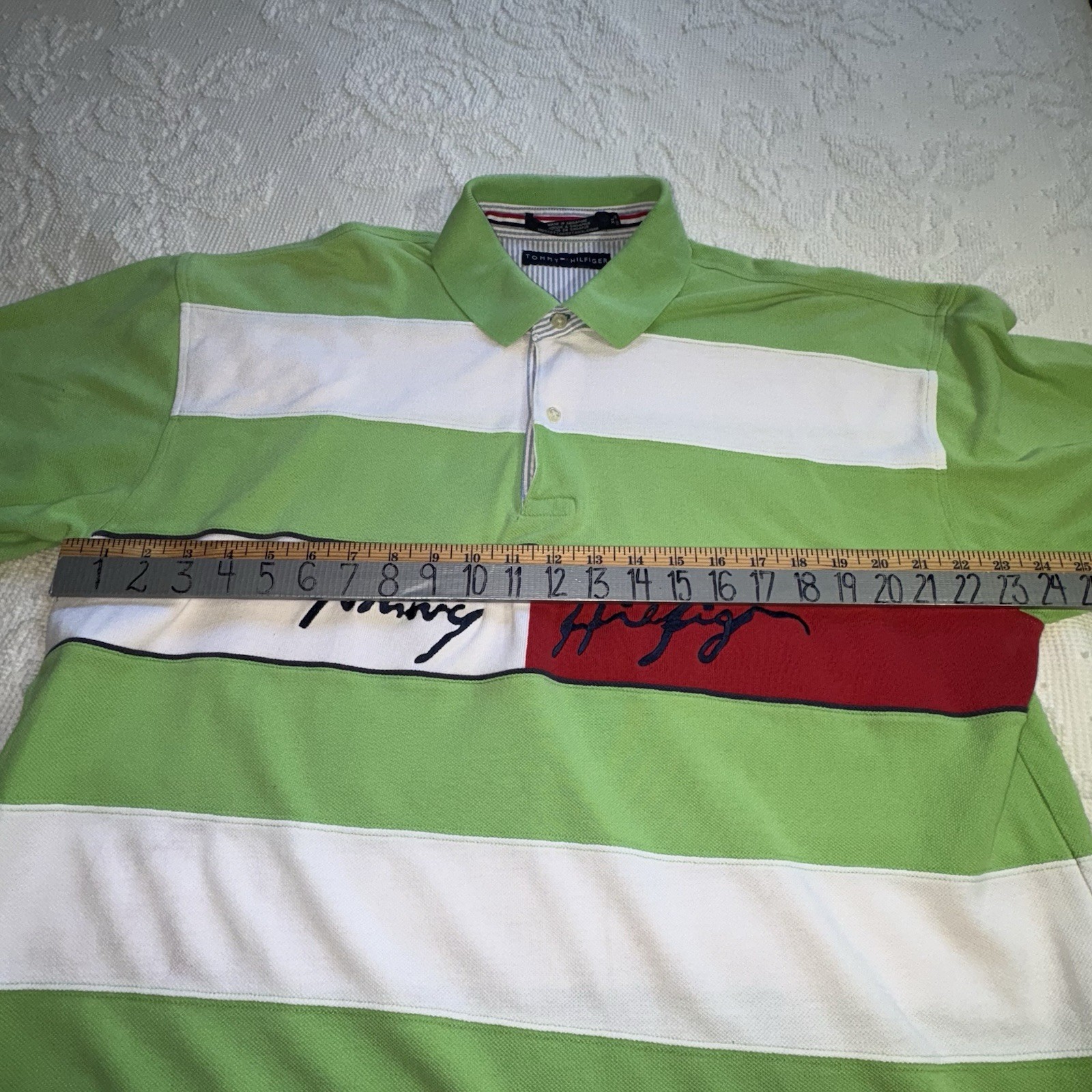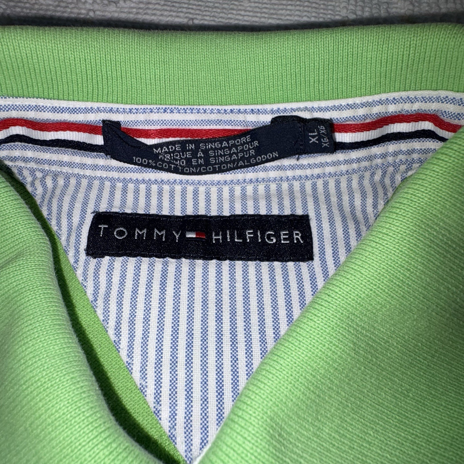 как выглядит Tommy Hilfiger Polo Shirt VTG Y2K Front Spell Out Mint Green White Stripes XL B фото