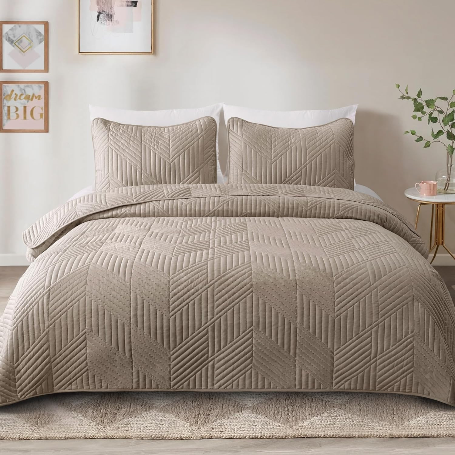 Ultrasonic Full Queen Quilt Bedding Set, Lightweight Taupe Bedspreads Soft Moder