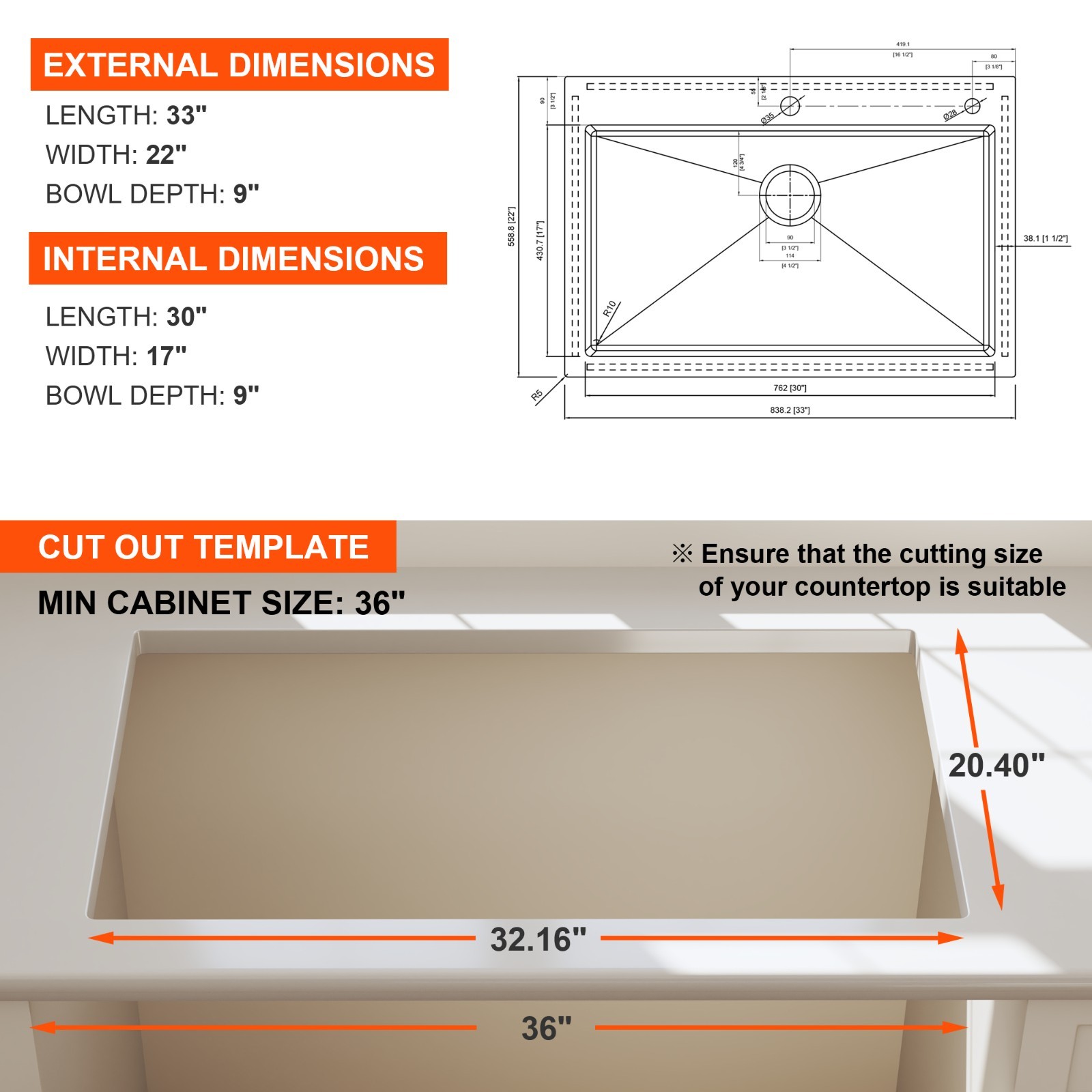 33x22 Drop In 16 Gauge Stainless Steel Topmount Kitchen Sink with Accessories