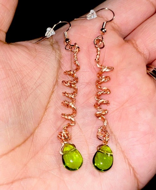 Handcrafted Copper Wire Dangle Earrings Green Glass Teardrop Beads Hook