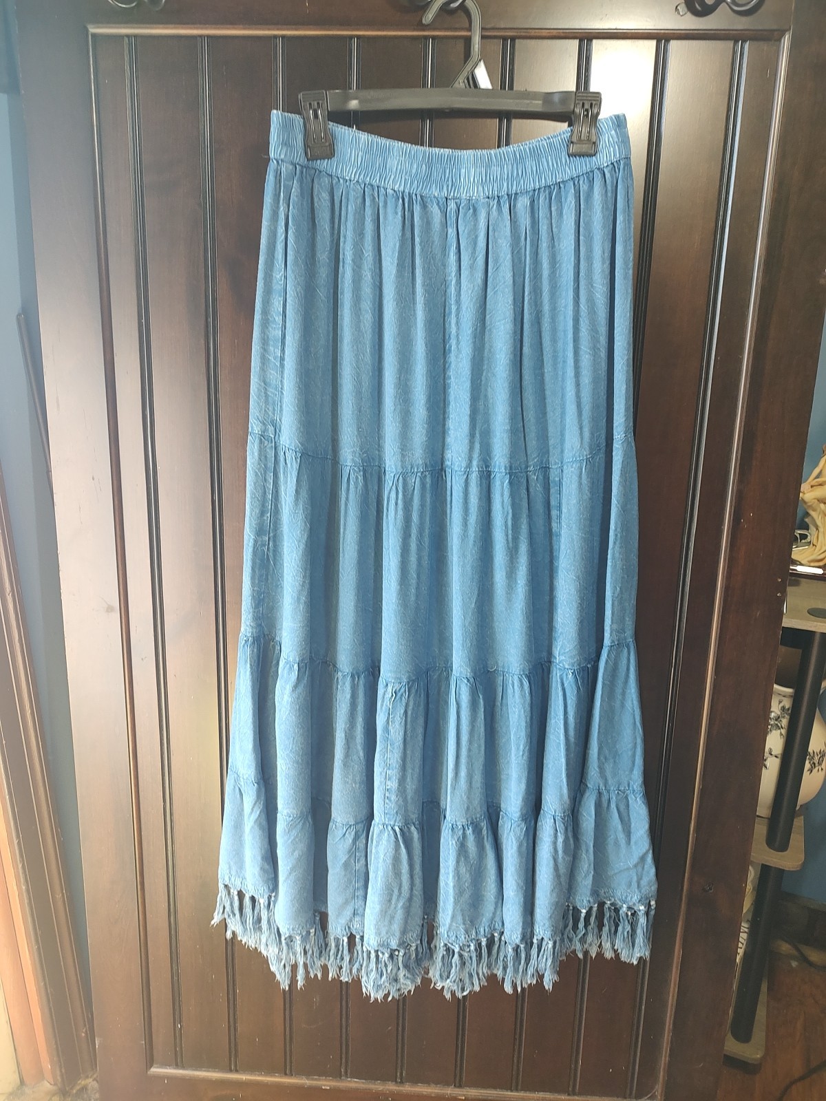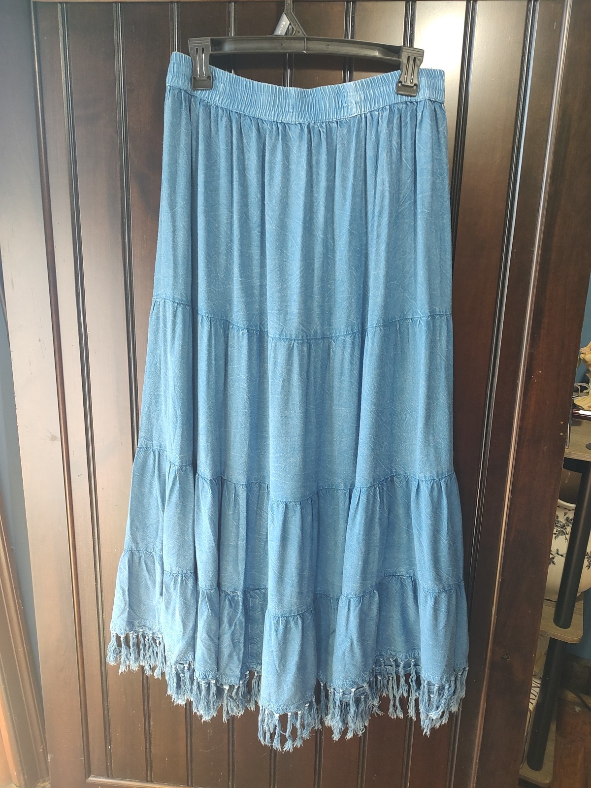 как выглядит Vtg 90s Silver Stream Tiered Maxi Skirt Blue Viscose Fringe Hem Boho Whimsigoth фото