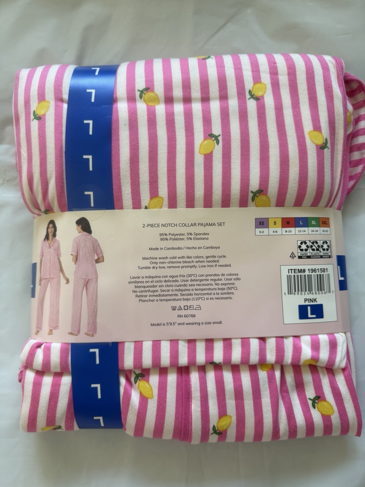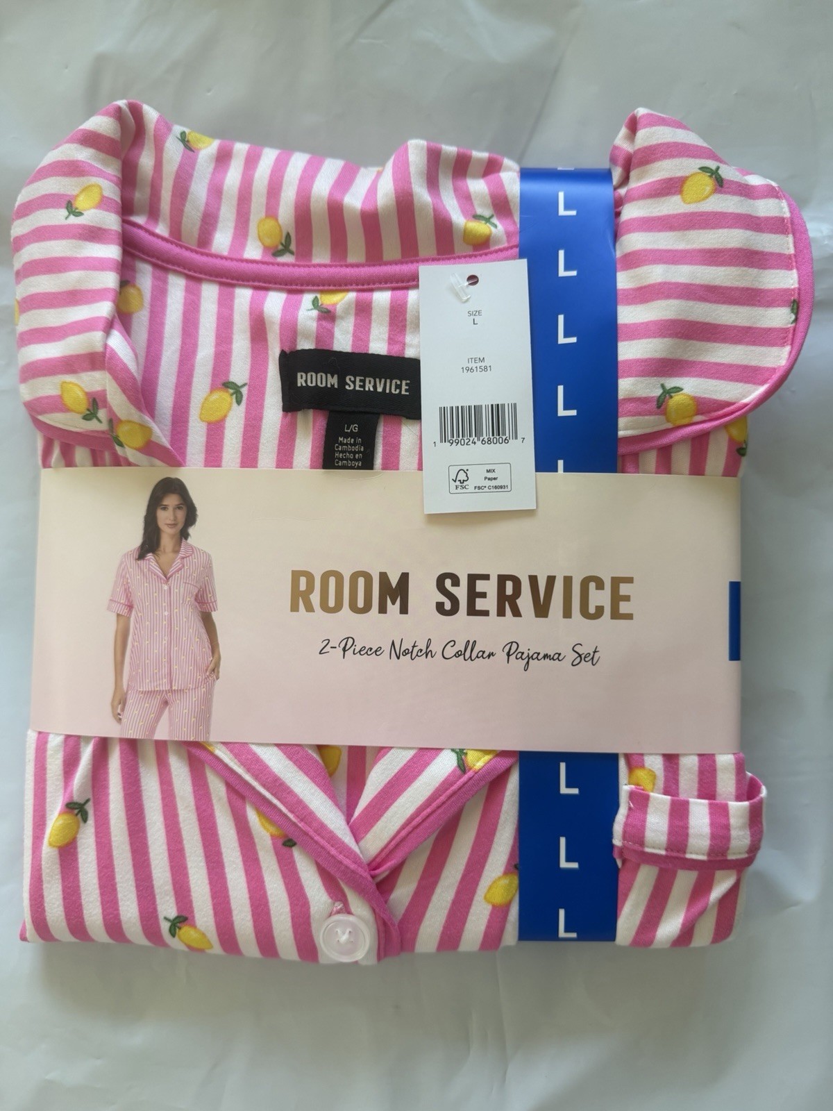 как выглядит Room Service Womens 2-Piece Shawl Collar Pajama Set, Pink Lemon Stripe, Large фото