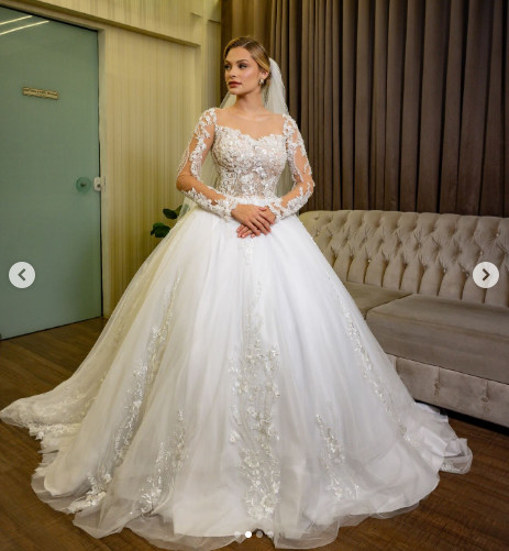 Princess Wedding Dress Long Sleeve Lace Applique Sweep Train A Line Bridal Gown