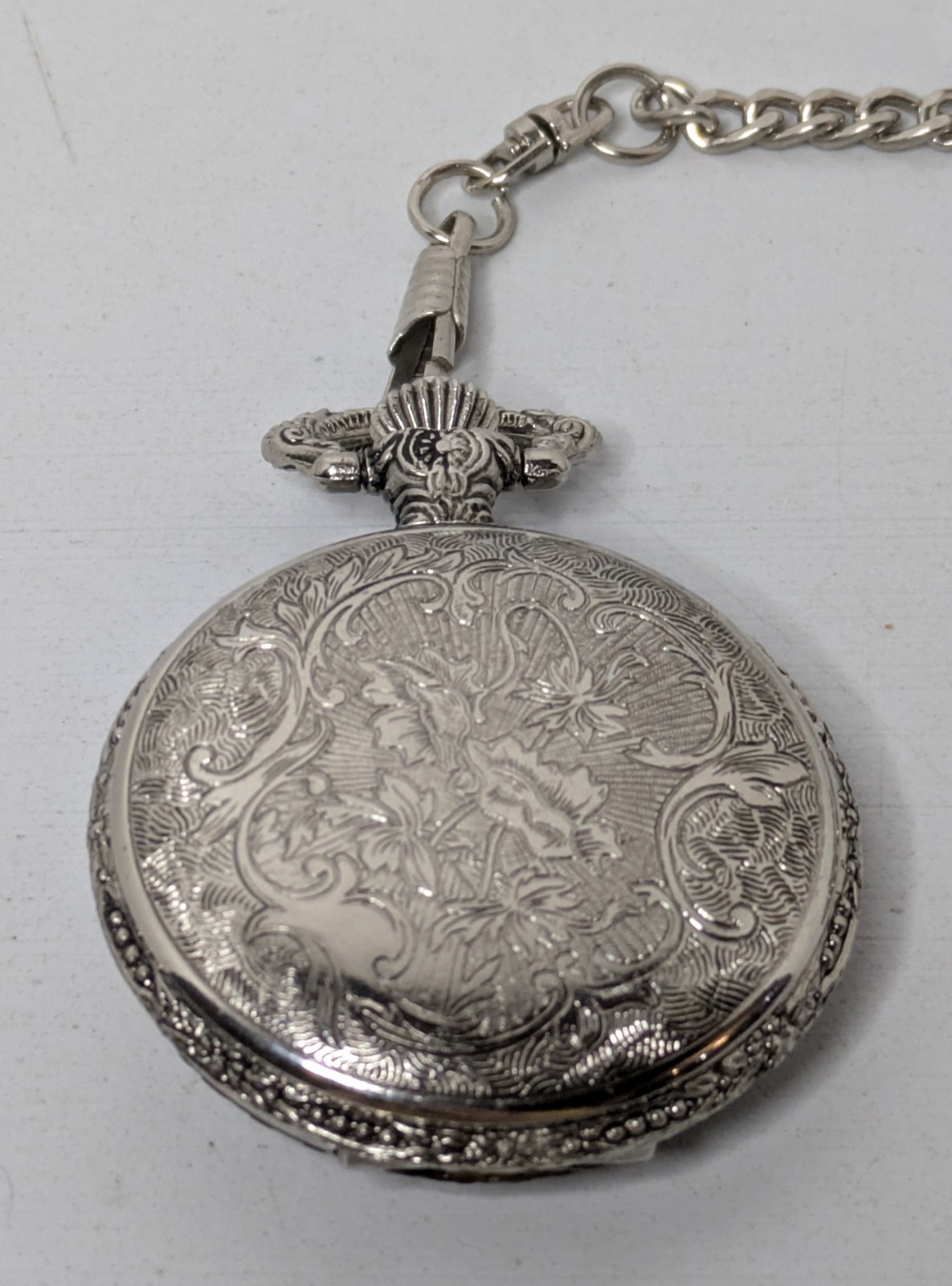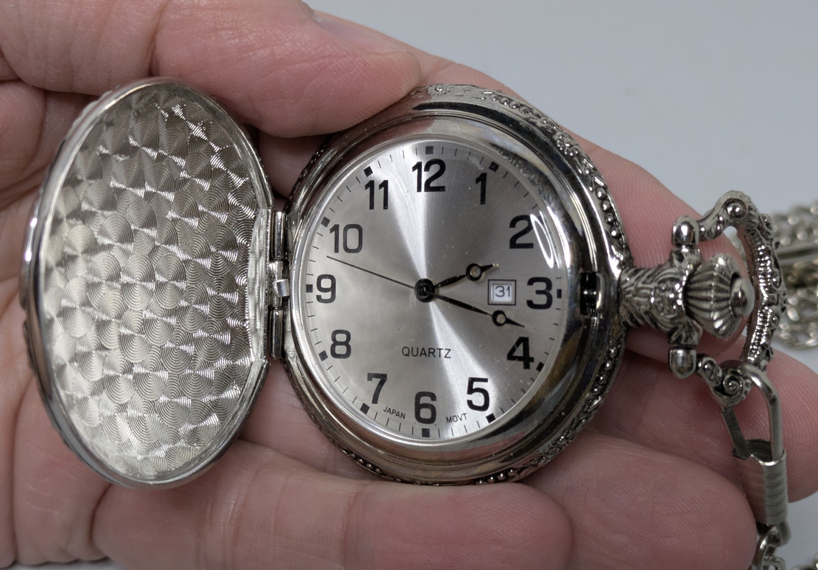 Особенности: 12-Hour Dial, Date Indicator, Easy to Read/Large Numerals, Includes Chain, Seconds Hand, Spring Cover