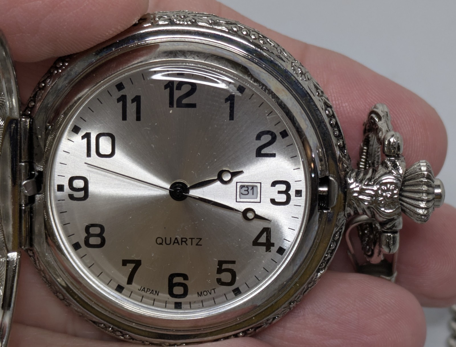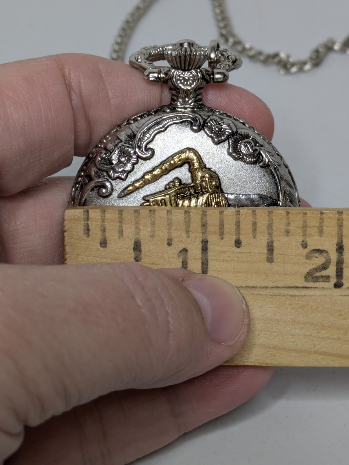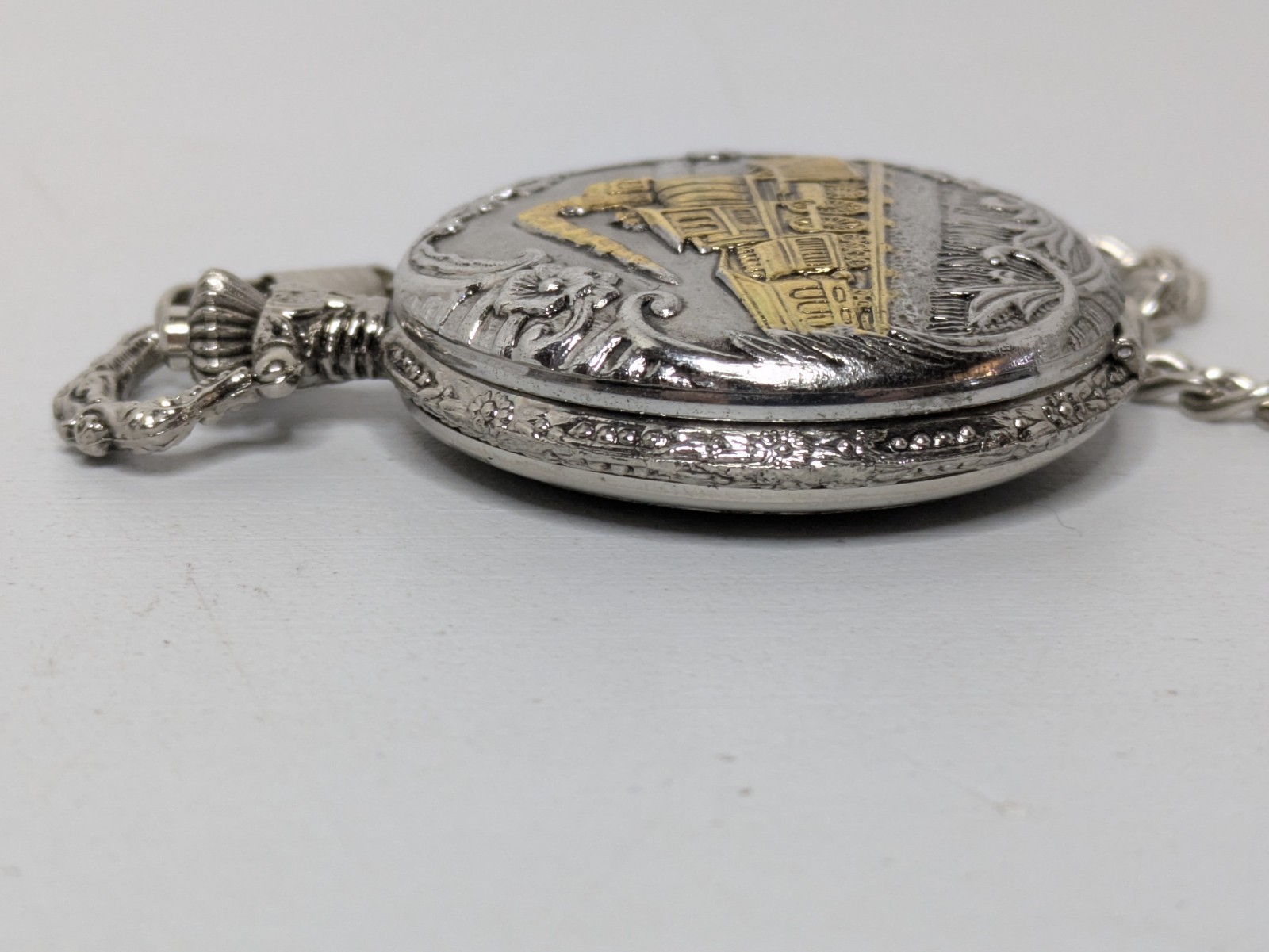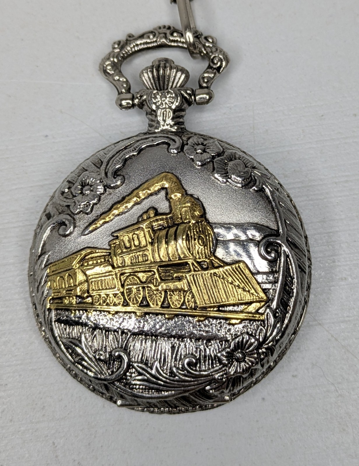 как выглядит Train Locomotive Pocket Watch Silver Gold Two Tone Needs Battery Quartz Japan фото