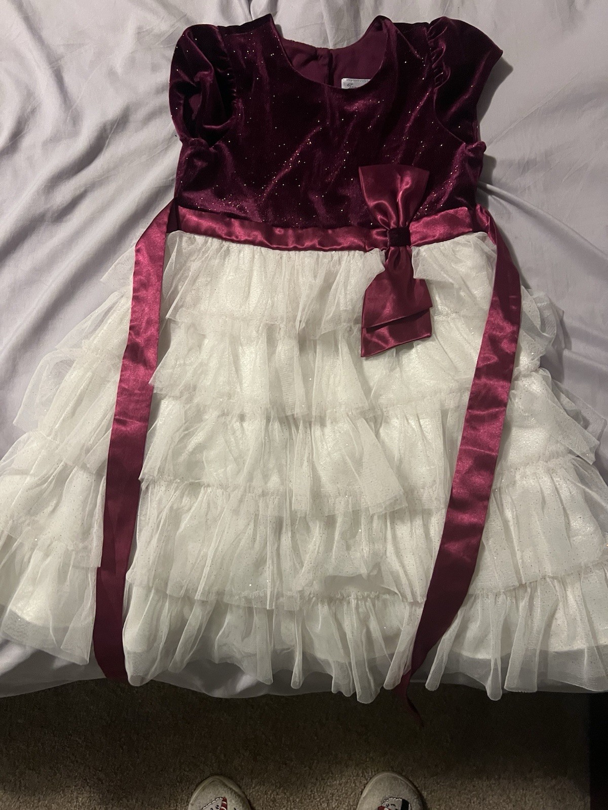 как выглядит Girls Velvet Tulle Fit Flare Cap Sleeve Party Dress Purple White Bow Layered фото