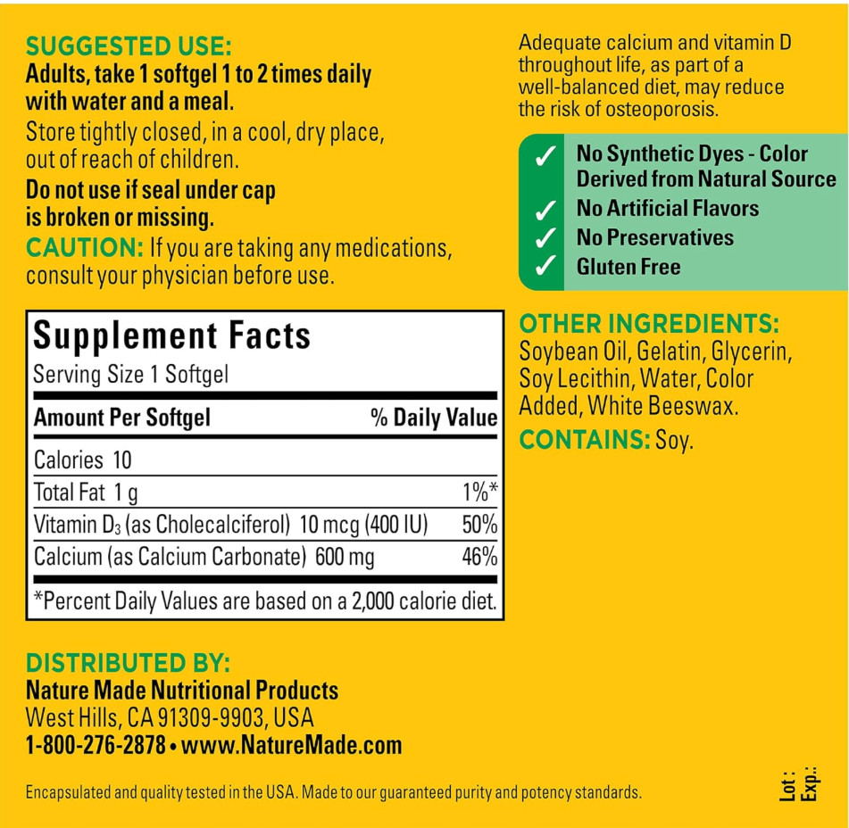 Nature Made Calcium 600 mg with Vitamin D3, Dietary Calcium Supplement for Bone