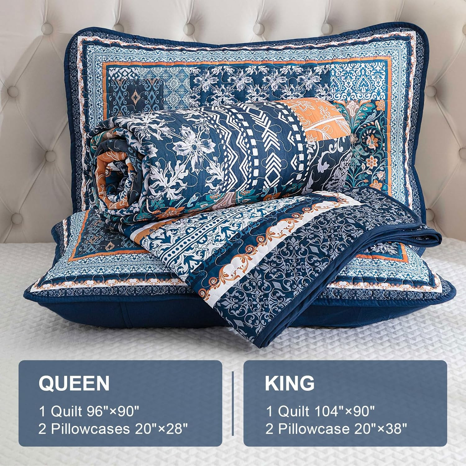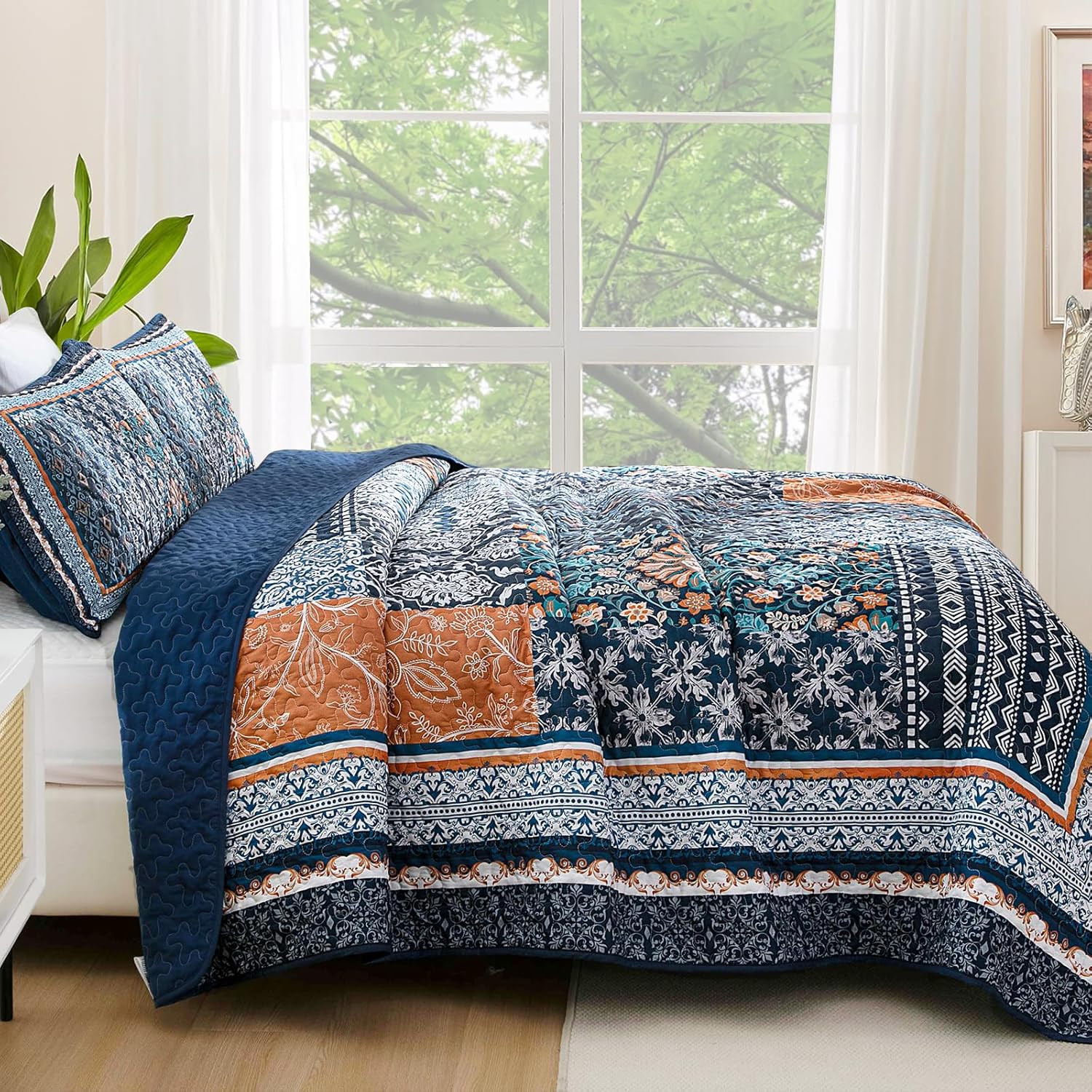 Navy Blue Quilt Set Queen Size,Bohemian Patchwork Bedspread Coverlet Set, Revers