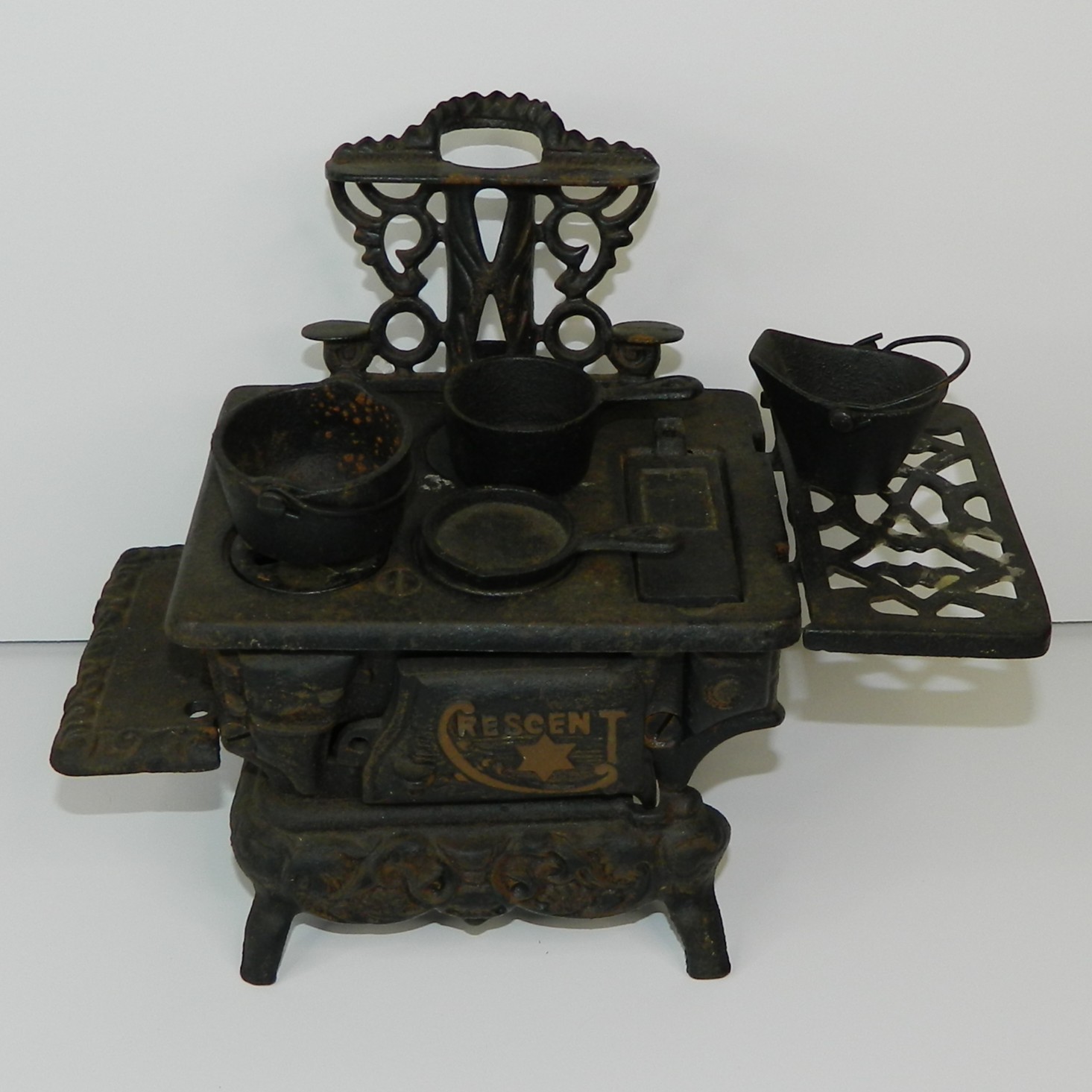 Antique Crescent Cast Iron Stove and Acessories- Children's Toy- Salesman Sample