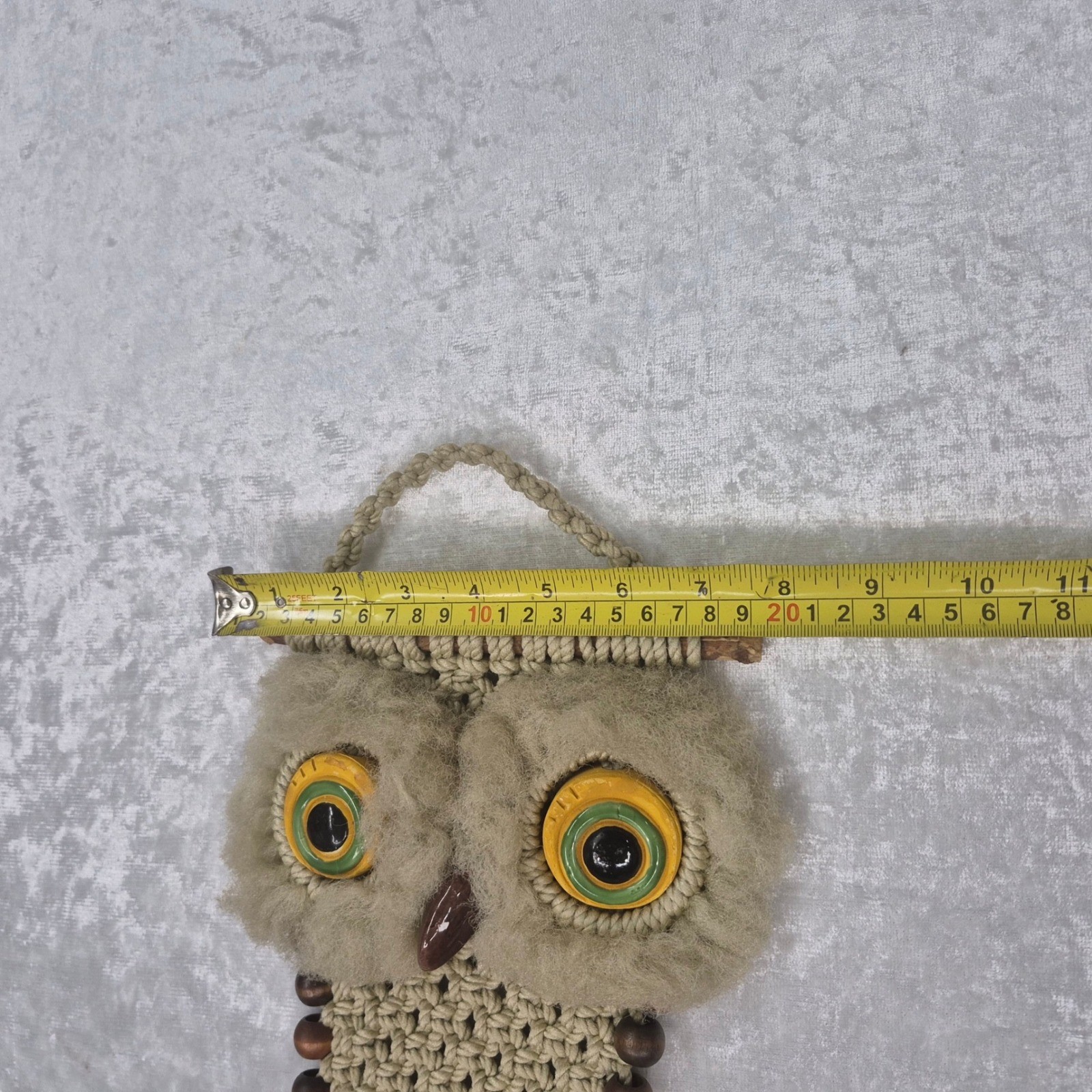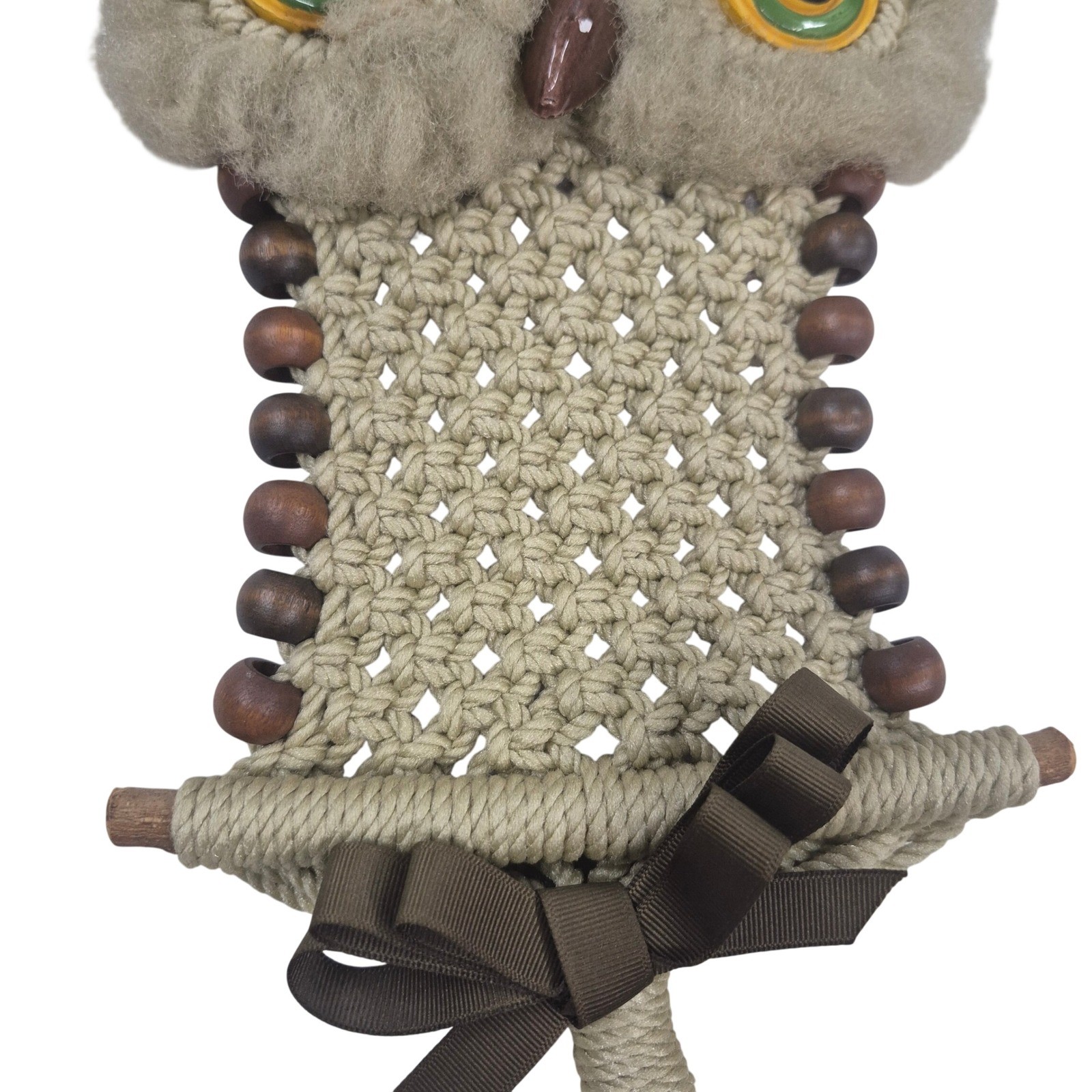 Vintage Macrame Owl Wall Hanging Boho Wood Bead Tassel Decor Beige 17 Inch
