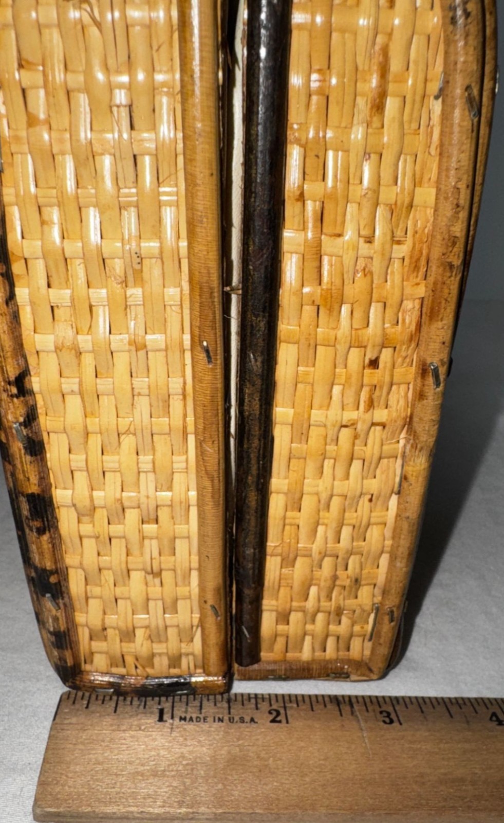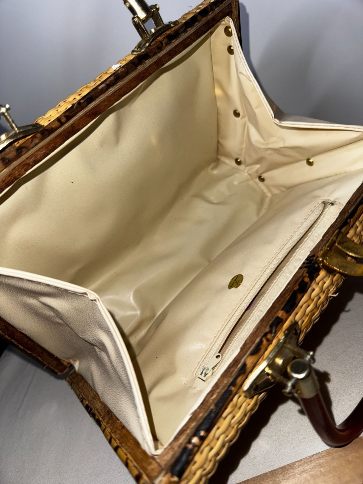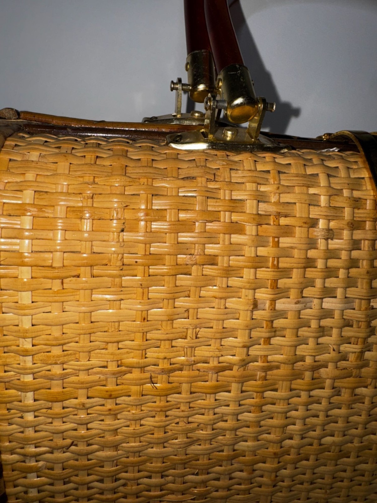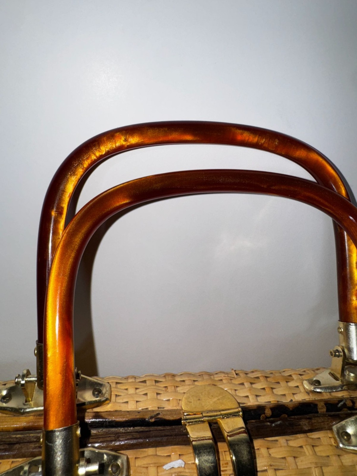 Vintage Wicker Tote Bag Rattan Purse Bamboo Butterscotch Bakelite Handles brass