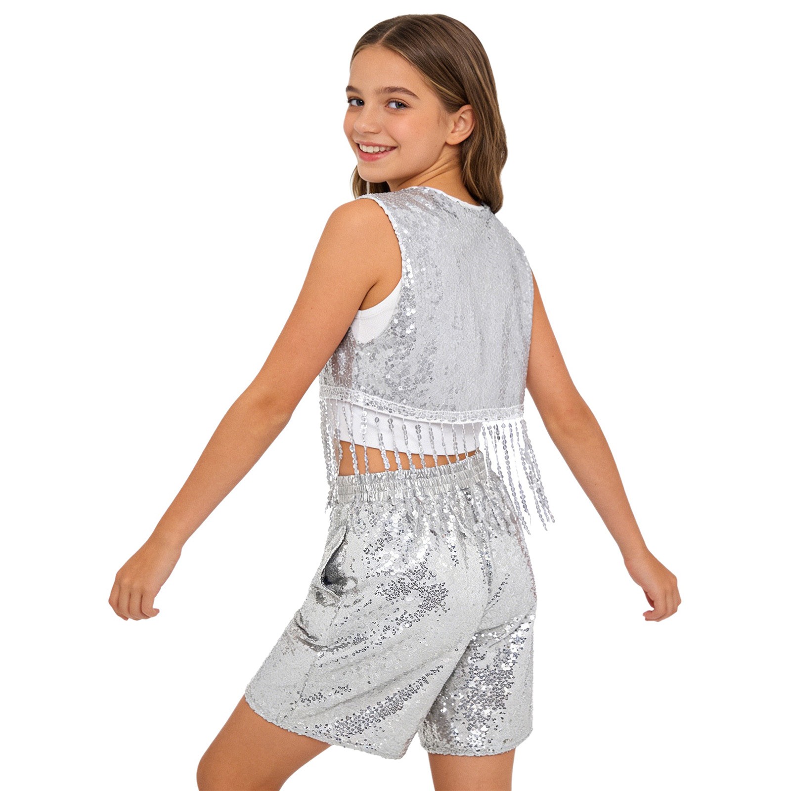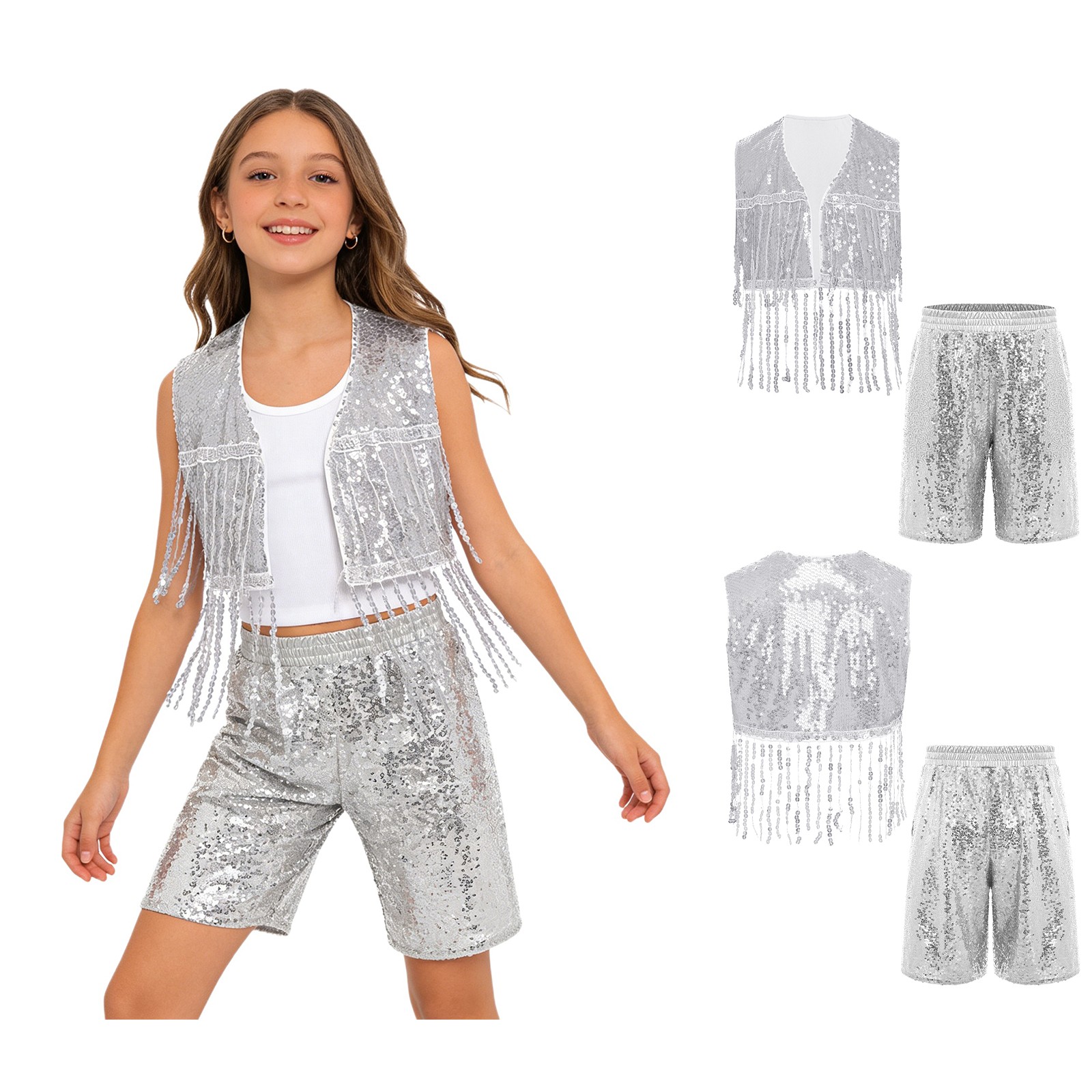 как выглядит Kids Shorts Set Samba Jazz Dance Party Sequin Vest Shiny Outfits Tiered Tassel фото