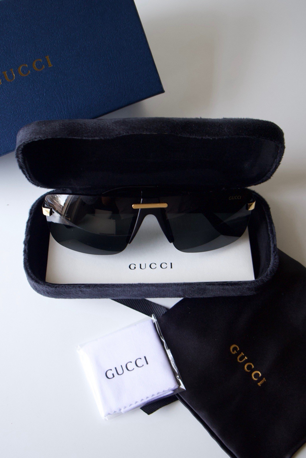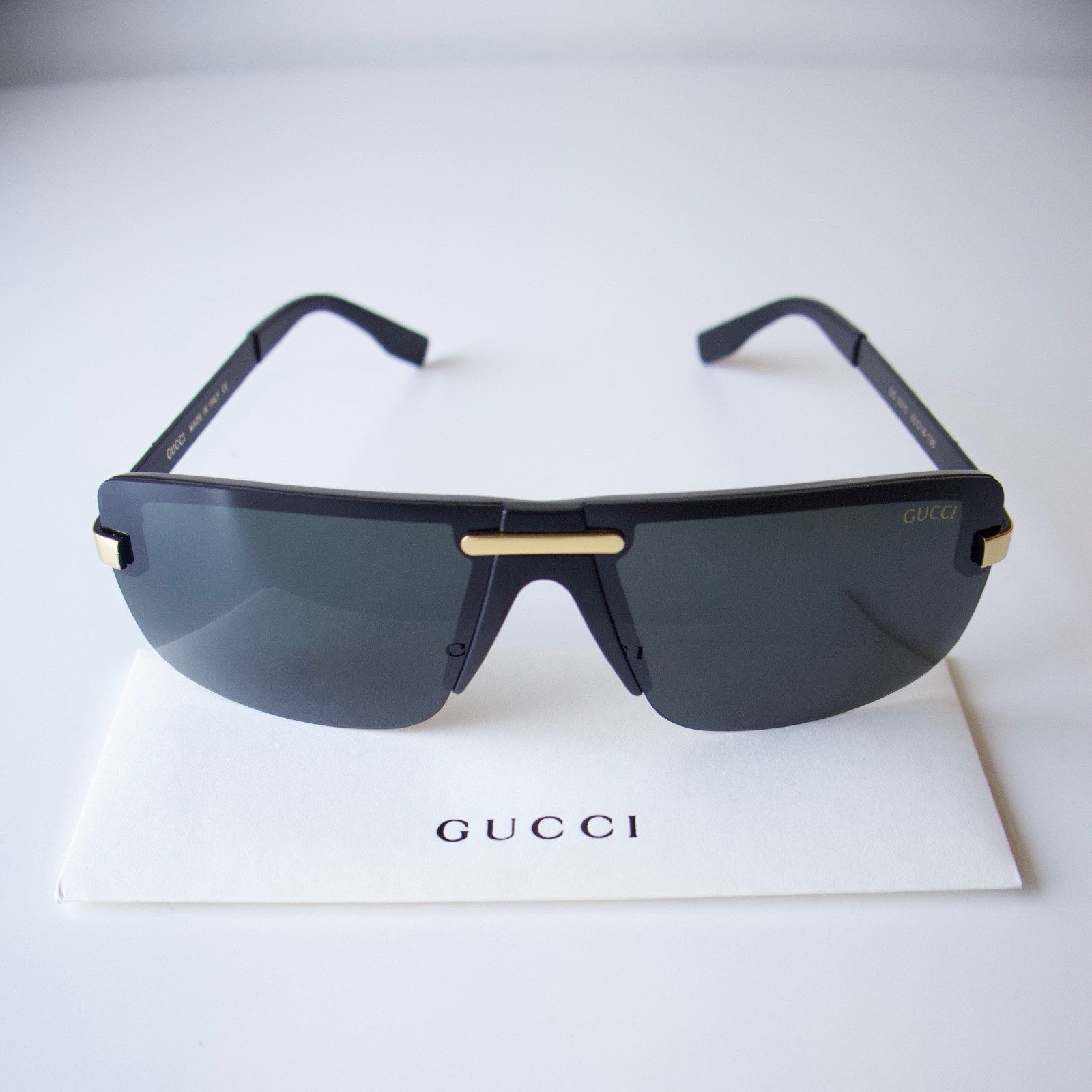 как выглядит Gucci GG5010 Shield Sunglasses Black Gold Rimless Wrap - Ships Today фото