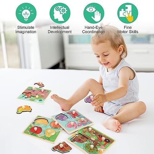 Educational Wooden Peg Puzzles Set for Toddlers 1-3, 4 Fun Themes - Farm, Dino,
