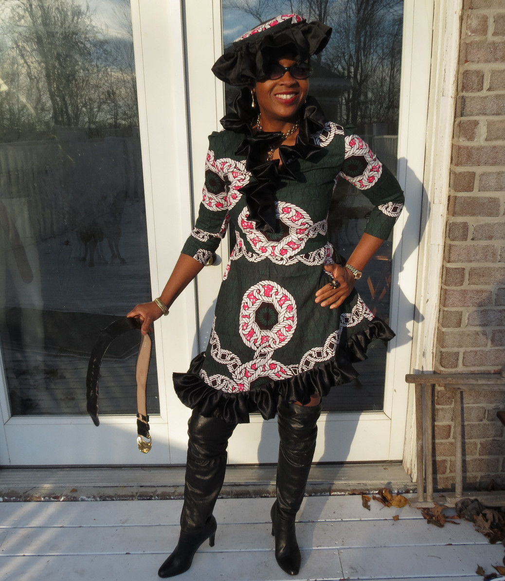 New Custom designer black ruffled African style dress gown S-6 free matching hat