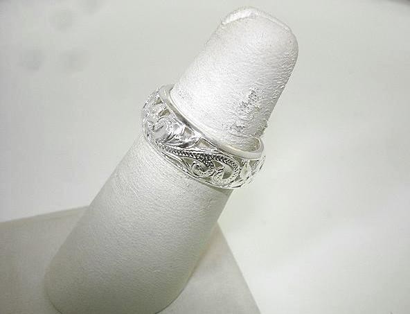 как выглядит 7.5MM 925 SILVER PIERCED OPENWORK HAWAIIAN PLUMERIA HERITAGE SCROLLS DOMED RING фото