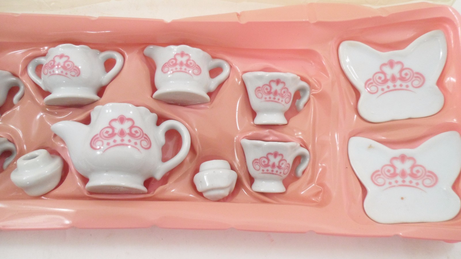 как выглядит 13 Pc 1970s Porcelain Childs Doll Pretend Play Tea Dish Set w/ Butterfly Plates фото