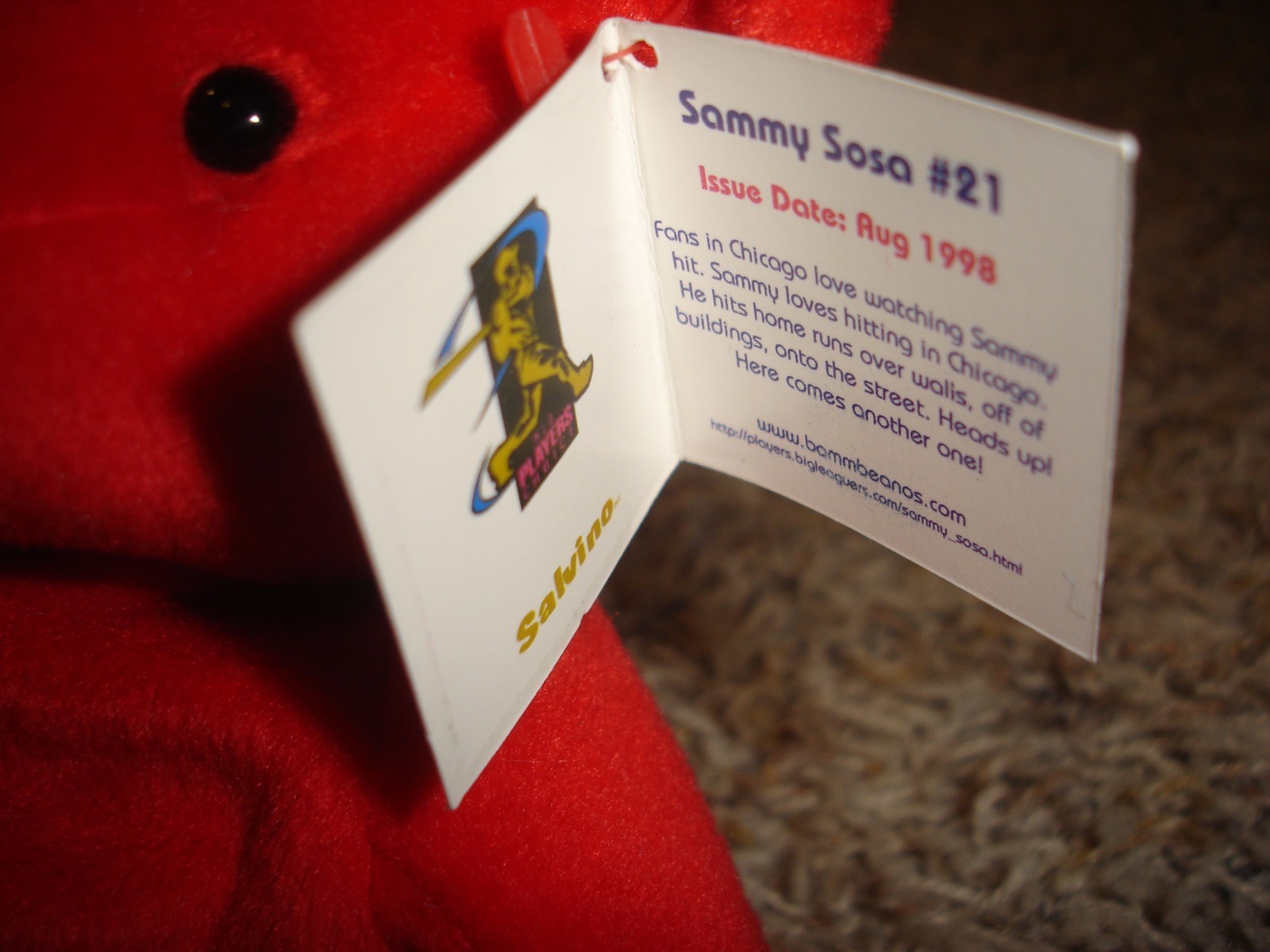 Sammy Sosa 21 bean bag MINT red bear Salvino's Bamm Beano August 1998