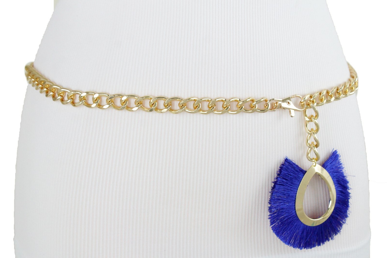 Women Gold Metal Chain Skinny Waistband Fashion Belt Blue Charm XS S M L XL XXL