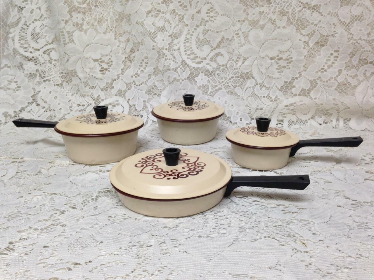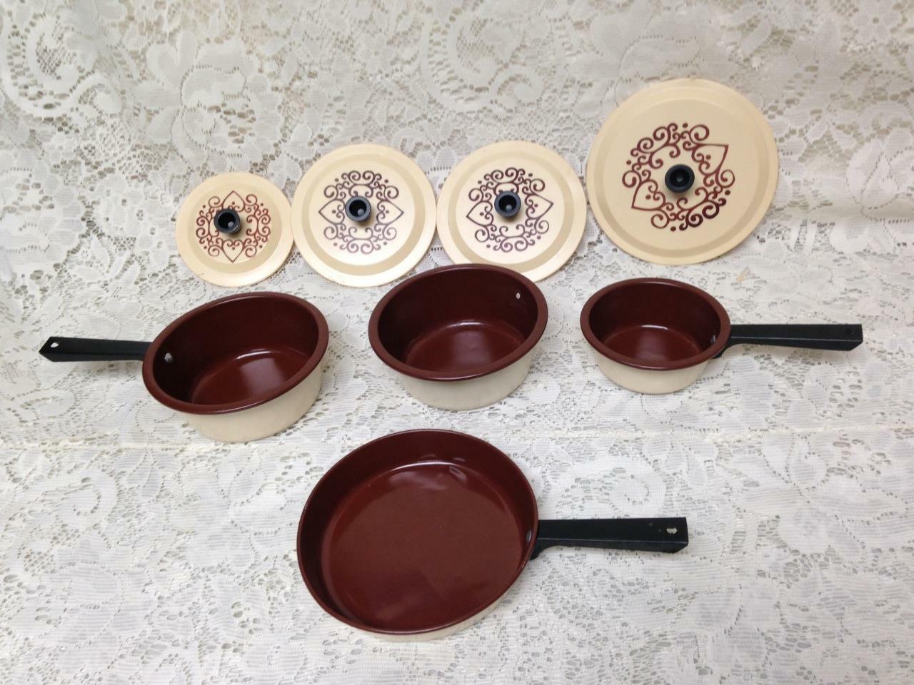 как выглядит 1960-70s Enamelware Style, 8pc Childs Tin-Plastic Cookware Set фото