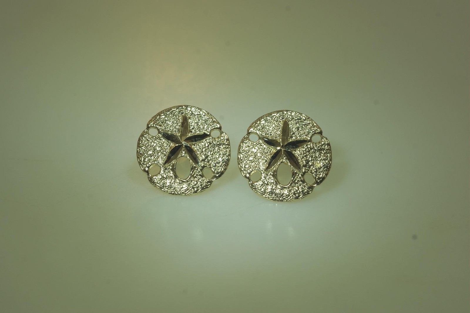 как выглядит 13MM SOLID 14K YELLOW GOLD DC TEXTURED HAWAIIAN SAND DOLLAR STUD EARRINGS 2 фото