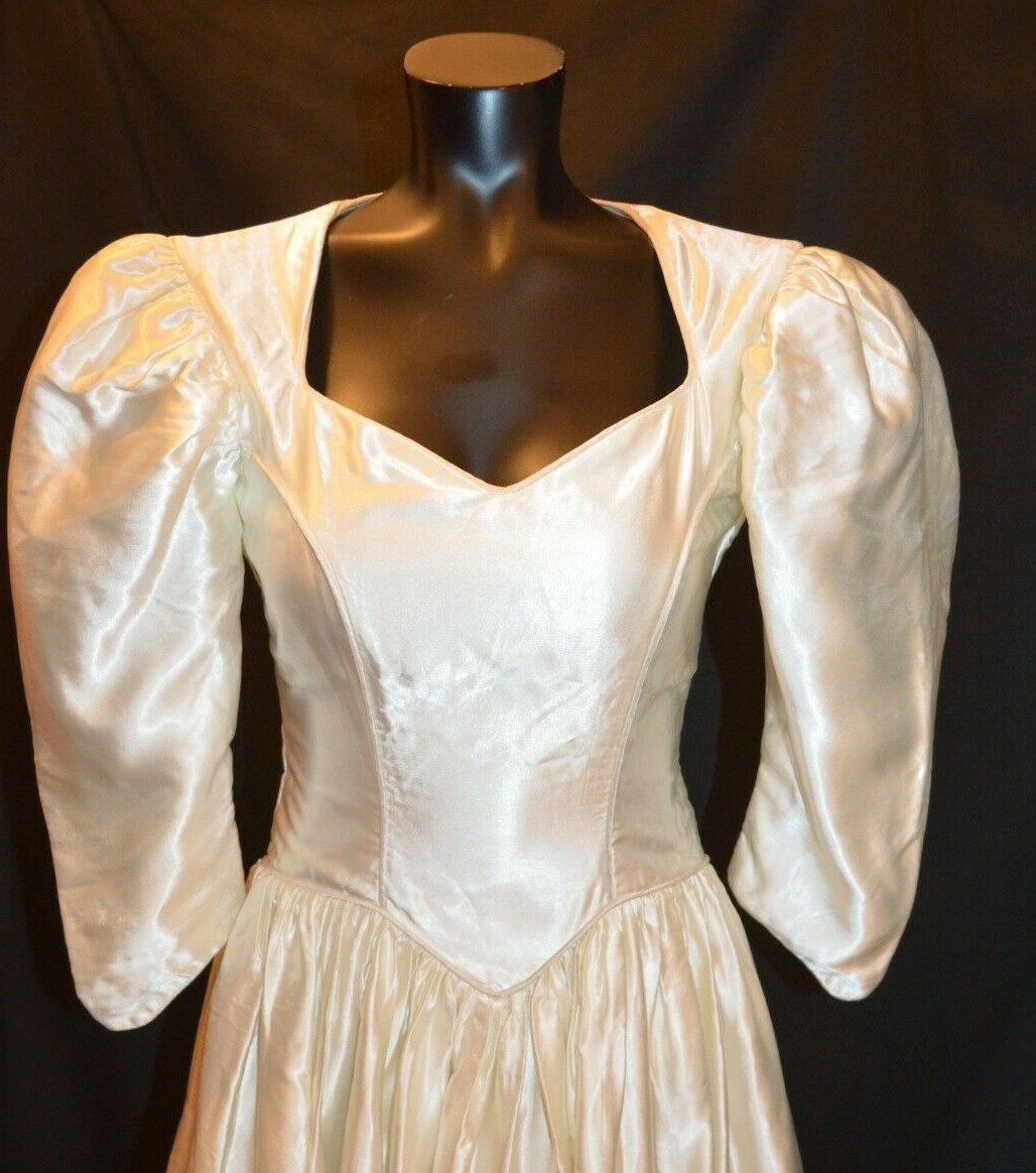 как выглядит ABLC Vintage 1980s 3/4 Sleeve Ivory Satin Sweetheart Wedding Dress sz 2 фото