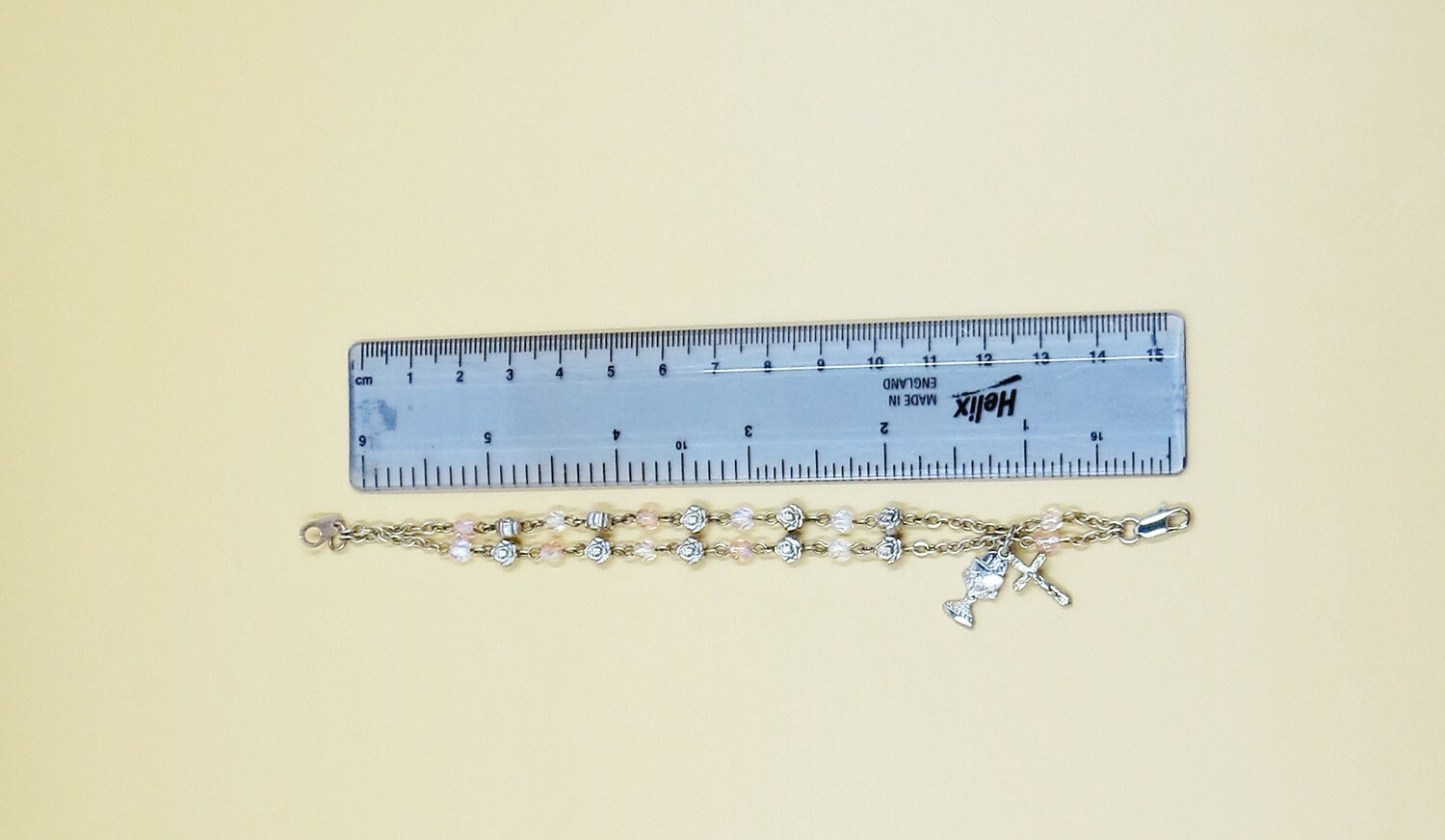 как выглядит First Communion Rosary Bracelet, pink and crystal with Rhodium chalice and cross фото