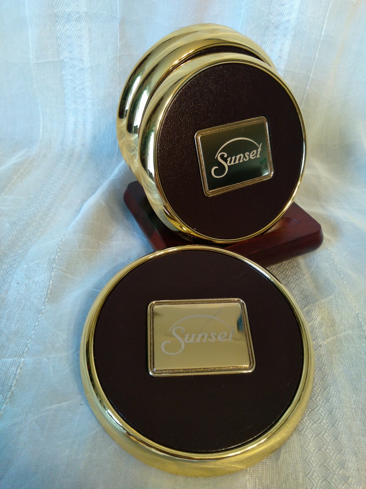 • SET OF 4 BRASS AND LEATHER SUNSET DRINK COASTERS WITH WOOD HOLDER BAR MANCAVE