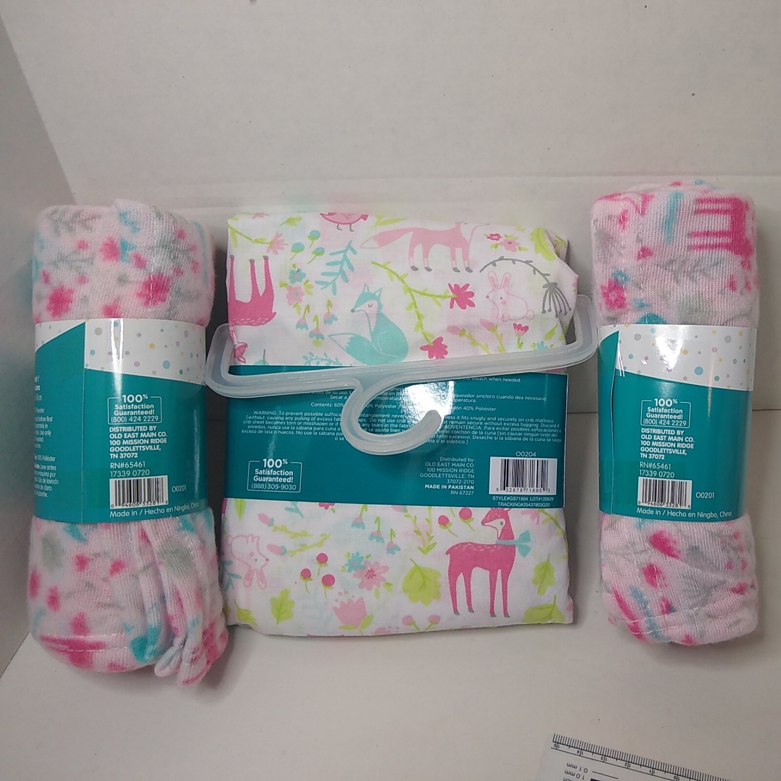 Woodland Animals 1 Crib Fitted Sheet 2 Pink Blankets New Gentle Steps