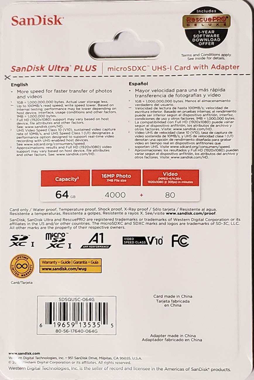 Sandisk Ultra PLUS 64GB MicroSDXC UHS-I Card with Adapter 100MB/s Class 10 U1 A1