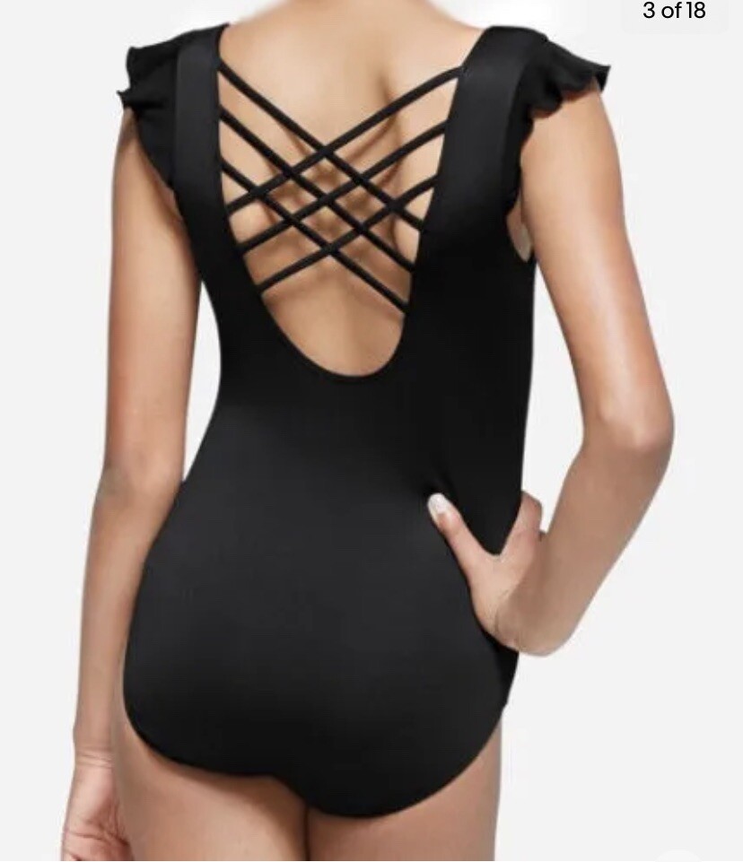 NWT Justice Girls Flutter Strappy Leotard Dance Gymnastics Scrunchie Black Sz 12