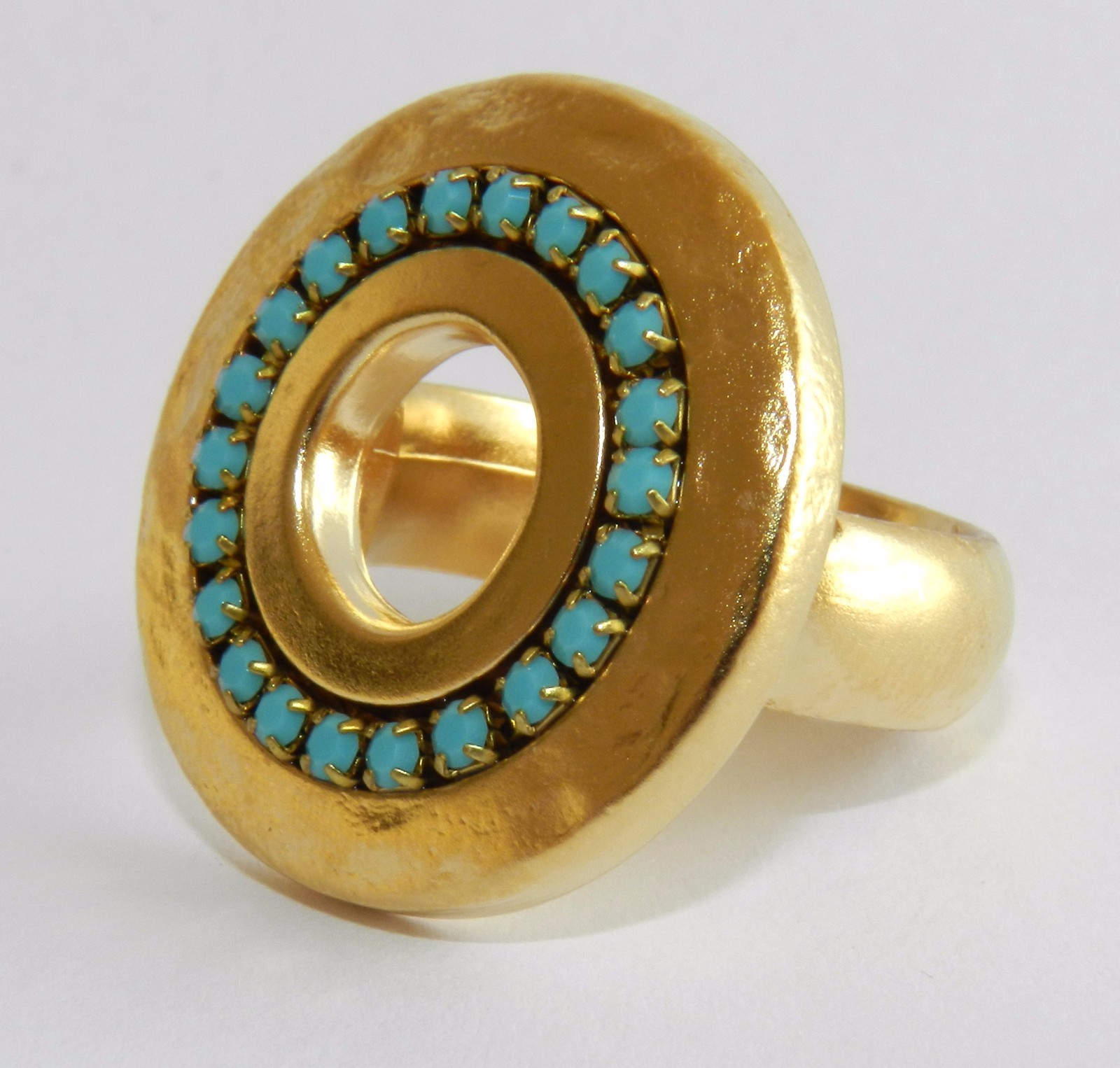 Designer Yellow Gold 24K Plated Round Hole Disc Ring Turquoise Stones Sz 8