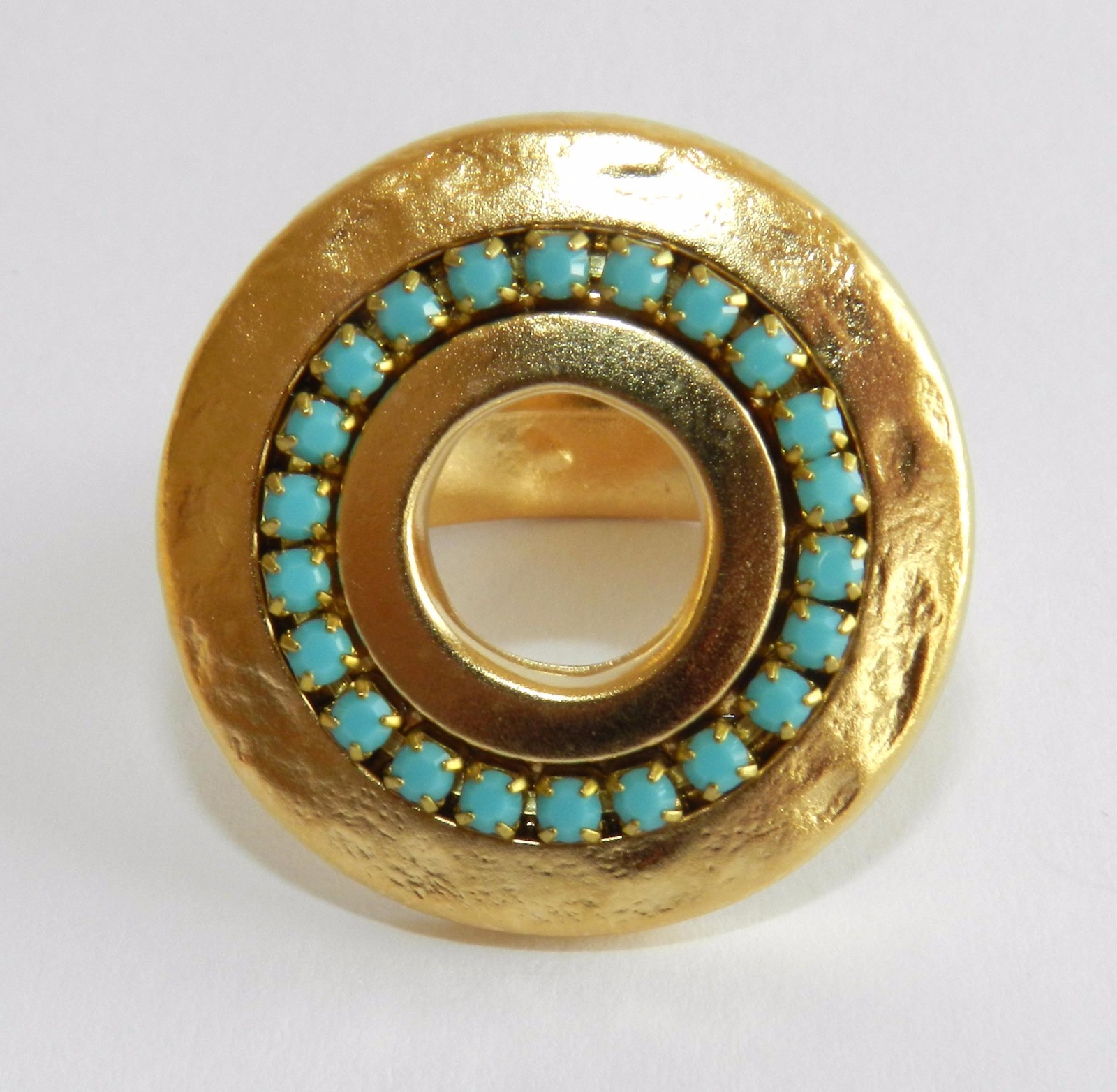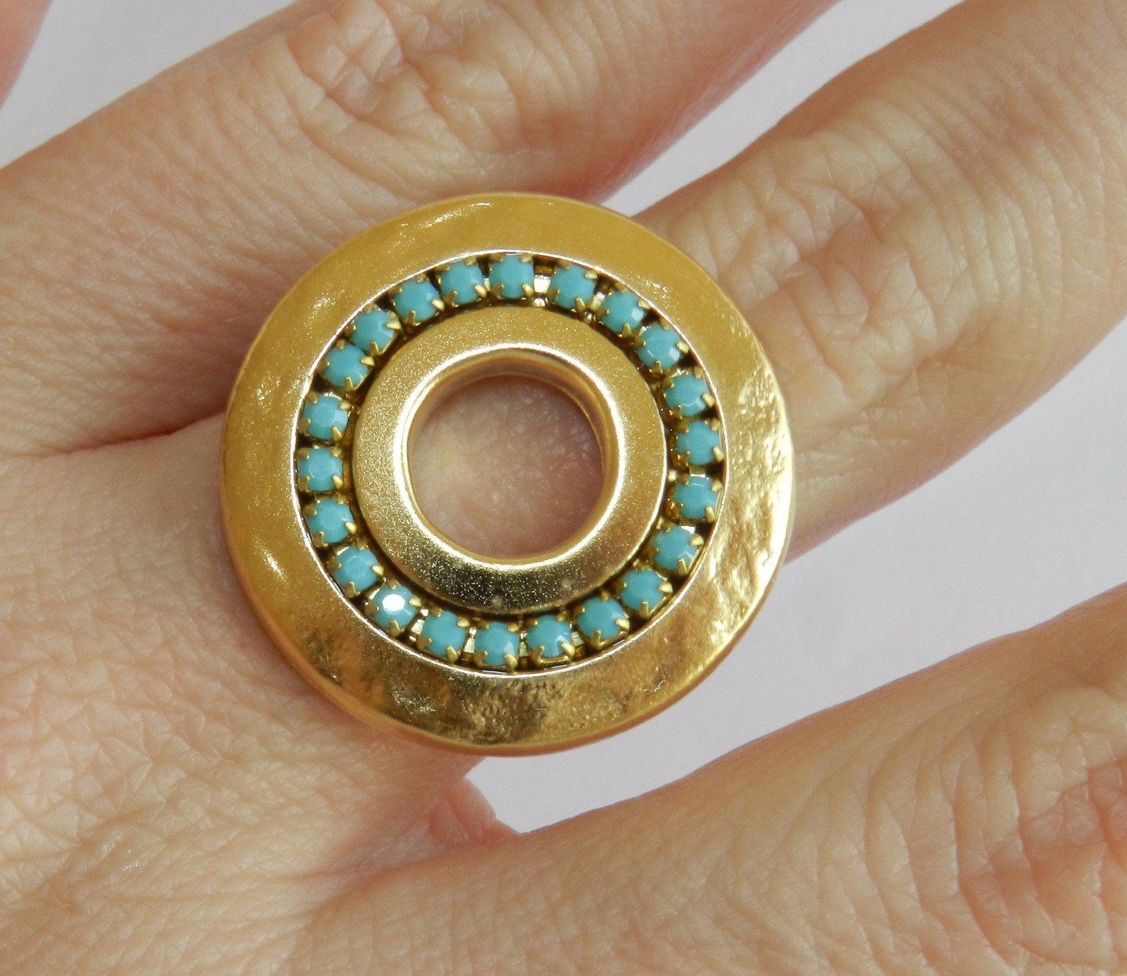 как выглядит Designer Yellow Gold 24K Plated Round Hole Disc Ring Turquoise Stones Sz 8 фото