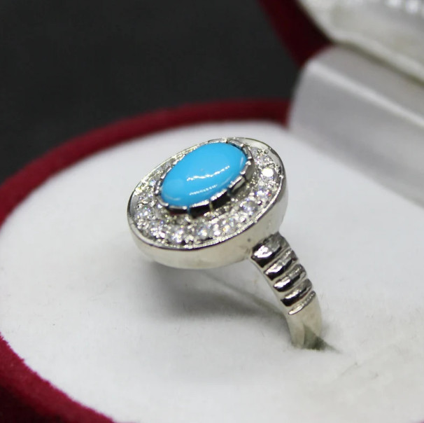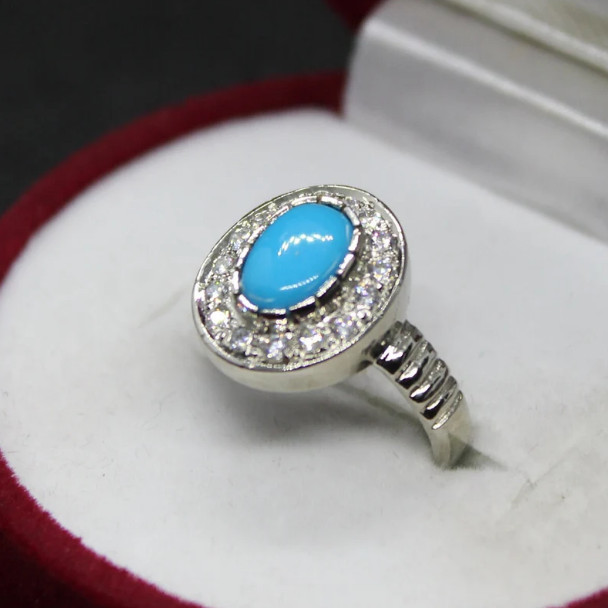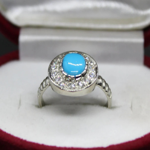 Natural Turquoise Stone Ring with White Zircons Blue Real Feroza Ring Silver 925
