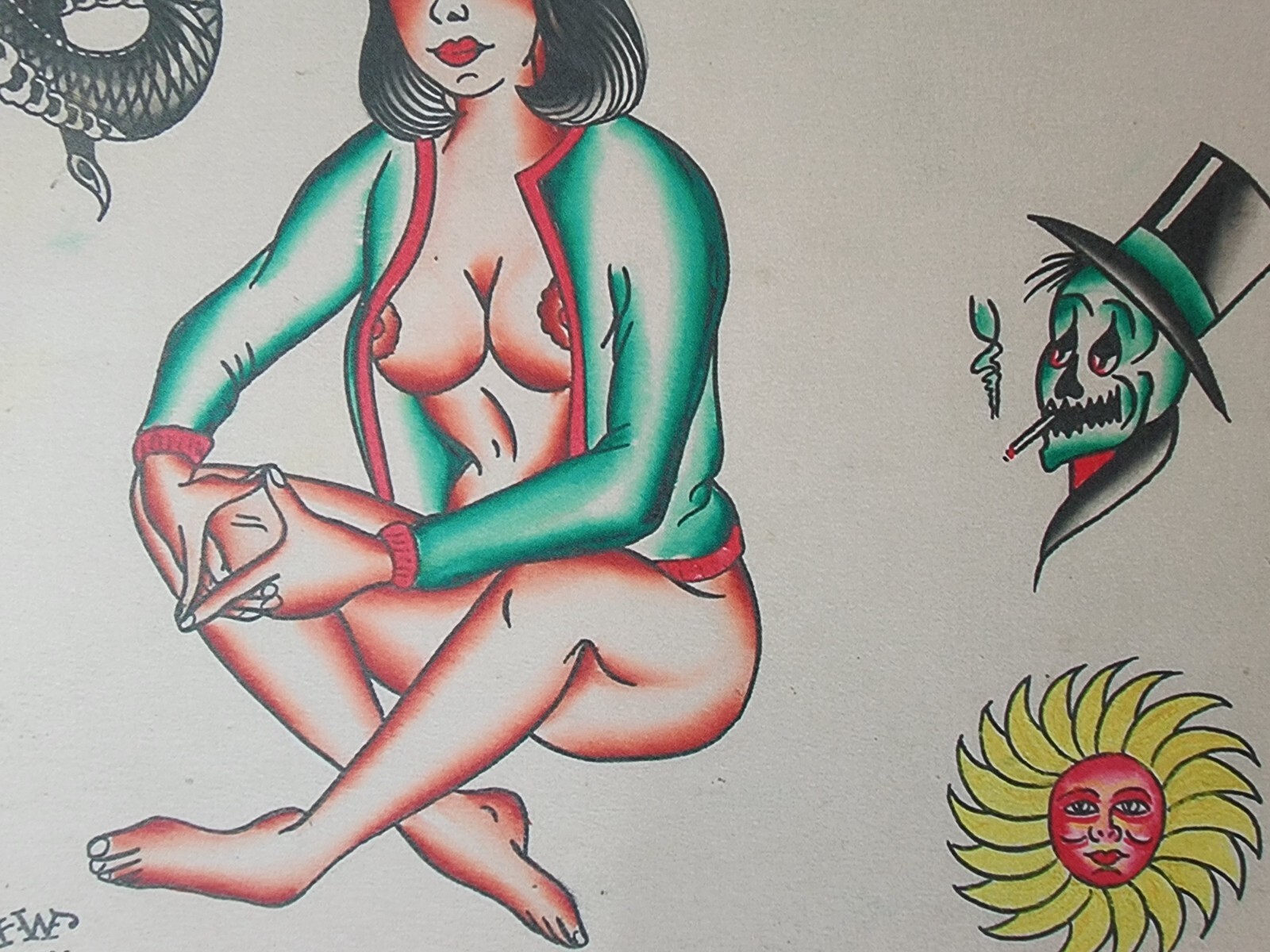 как выглядит Bob Shaw Traditional Vintage Style Tattoo Flash Sheet 75 Girl, Snake, Skull, Sun фото
