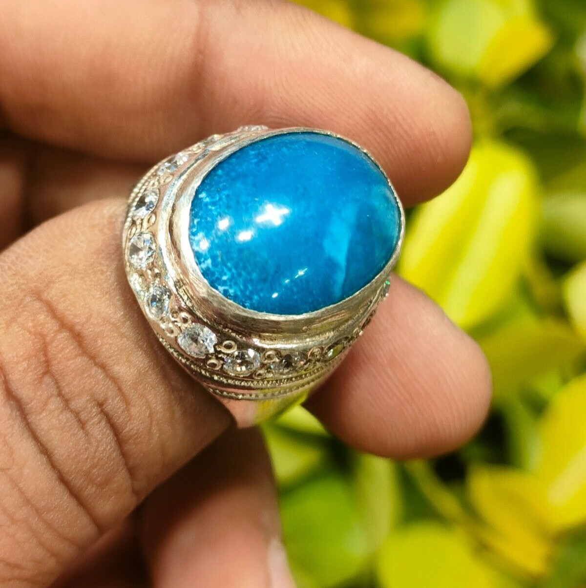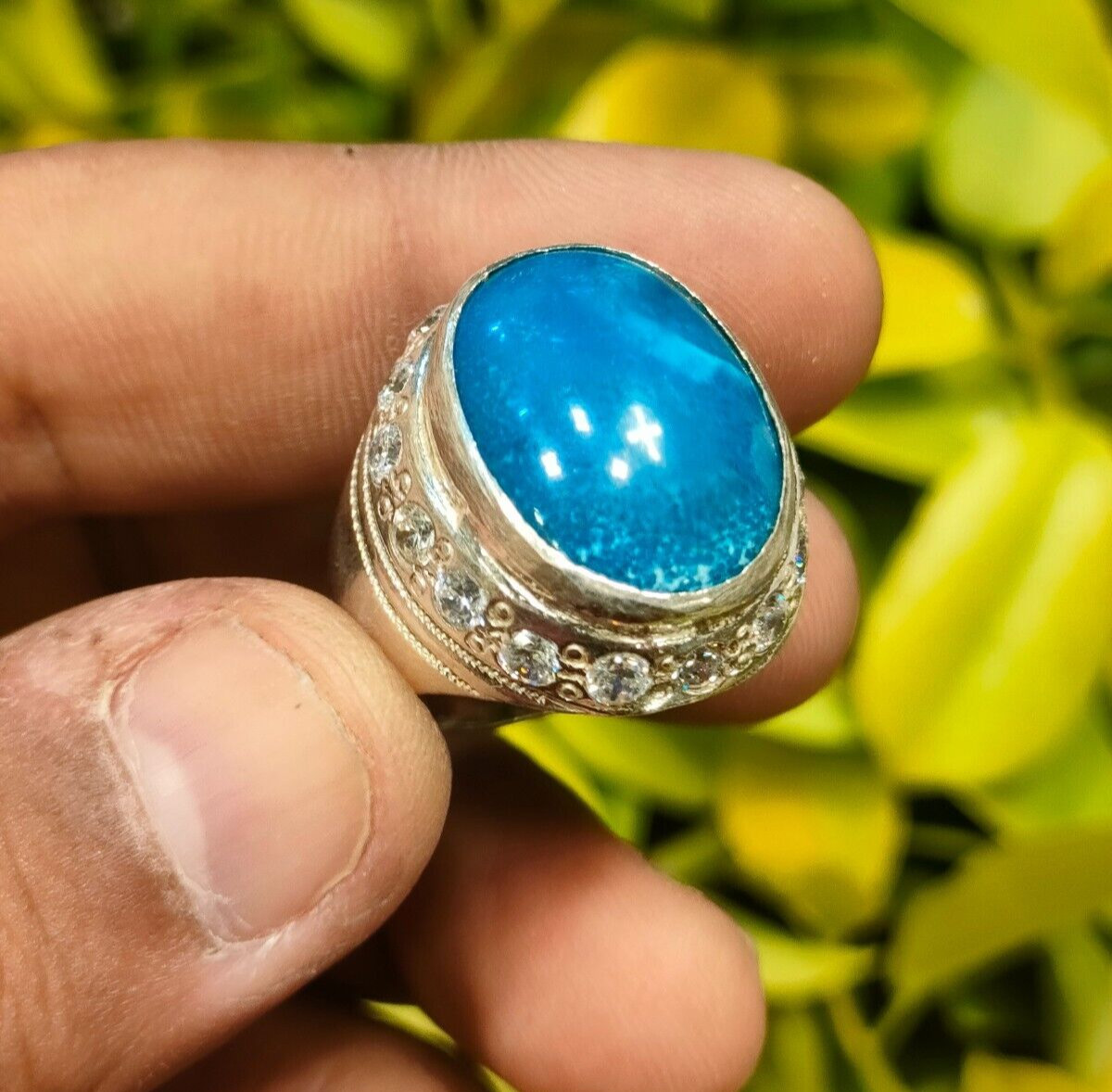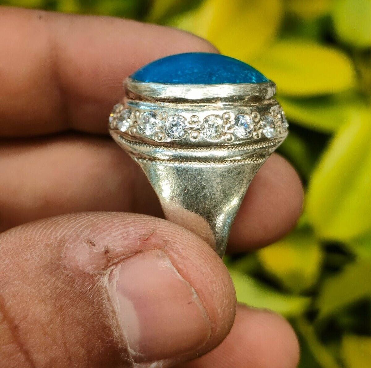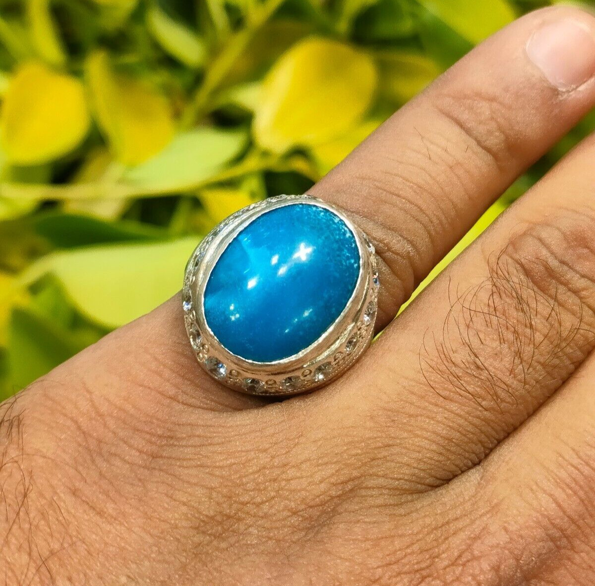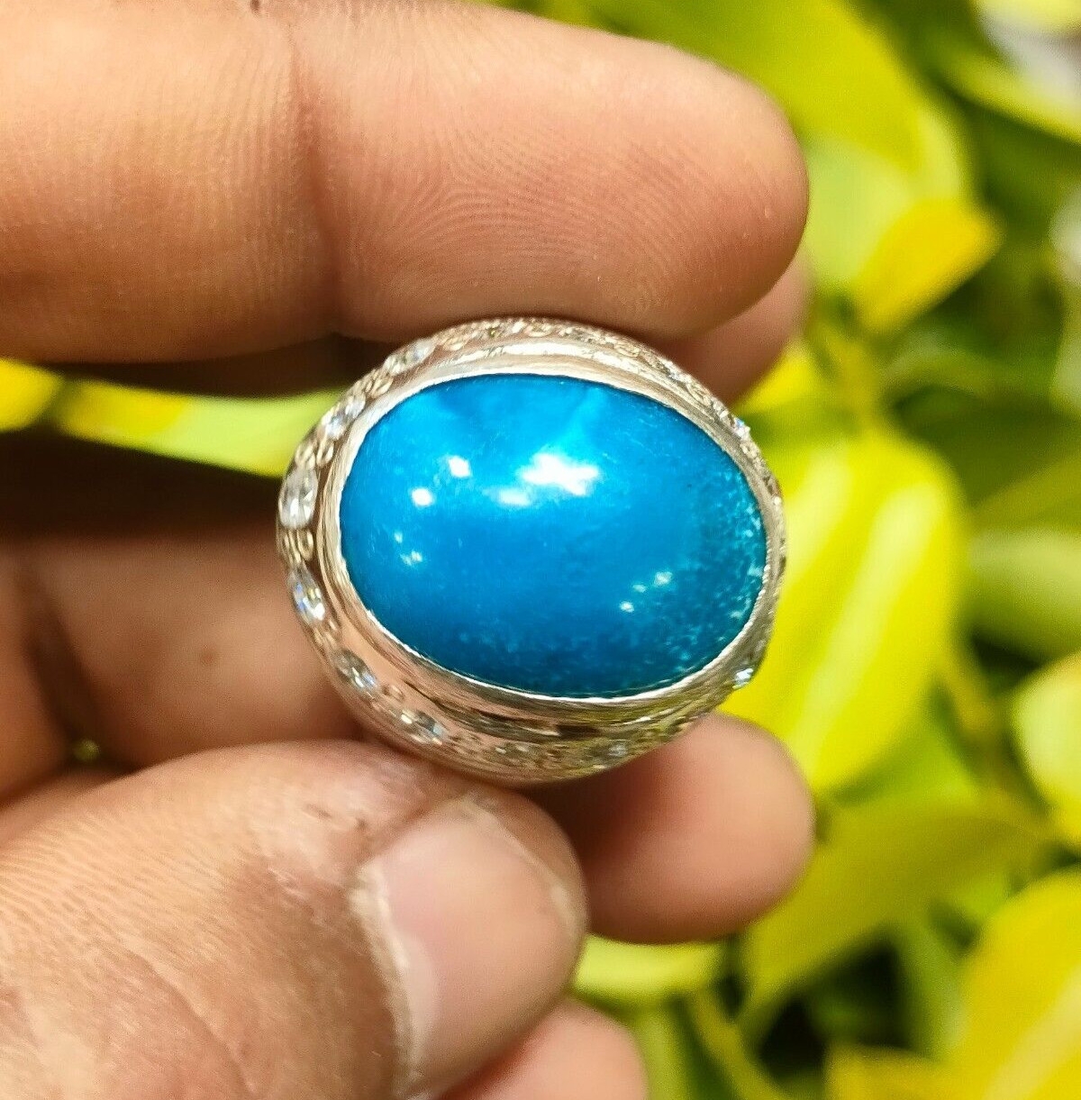 как выглядит Beautiful Natural Feroza Stone Ring with White Zircons Real Turquoise Silver 925 фото