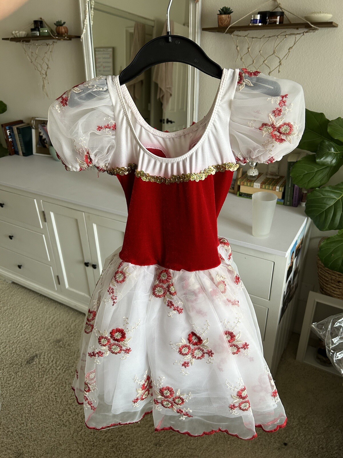 Girls Medium White and Red Ballet Dance Tutu Dress with leotard attached