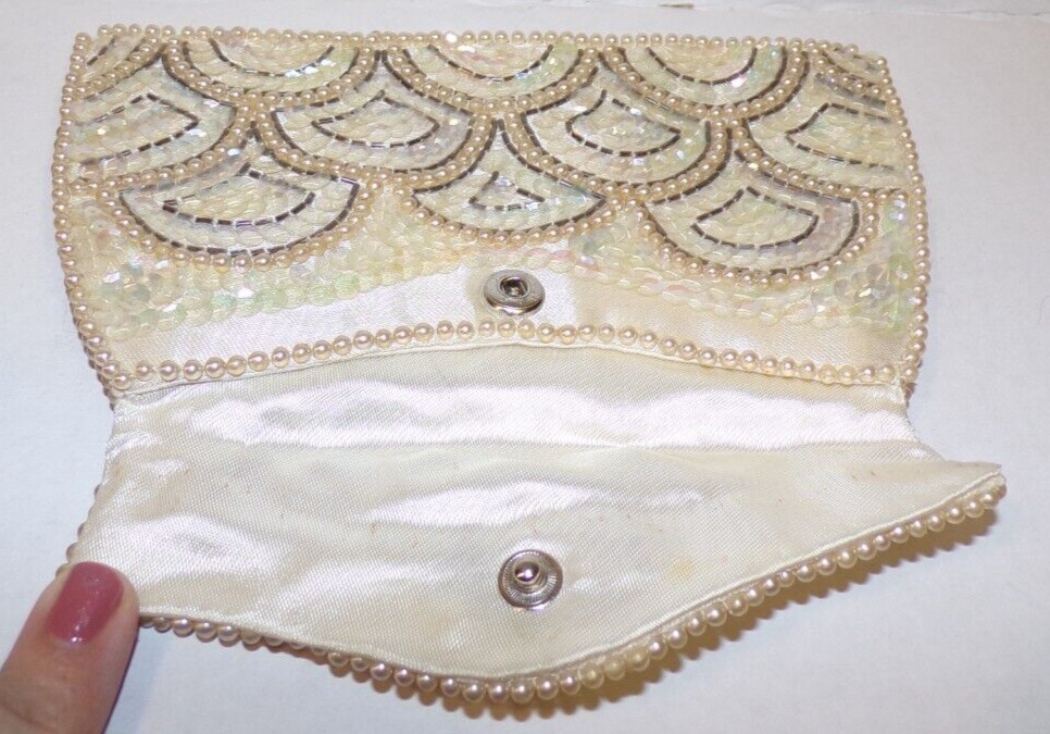 как выглядит La Regale Beaded Ivory Clutch Purse Satin Pearls Sequin Art Deco Evening Bag VTG фото