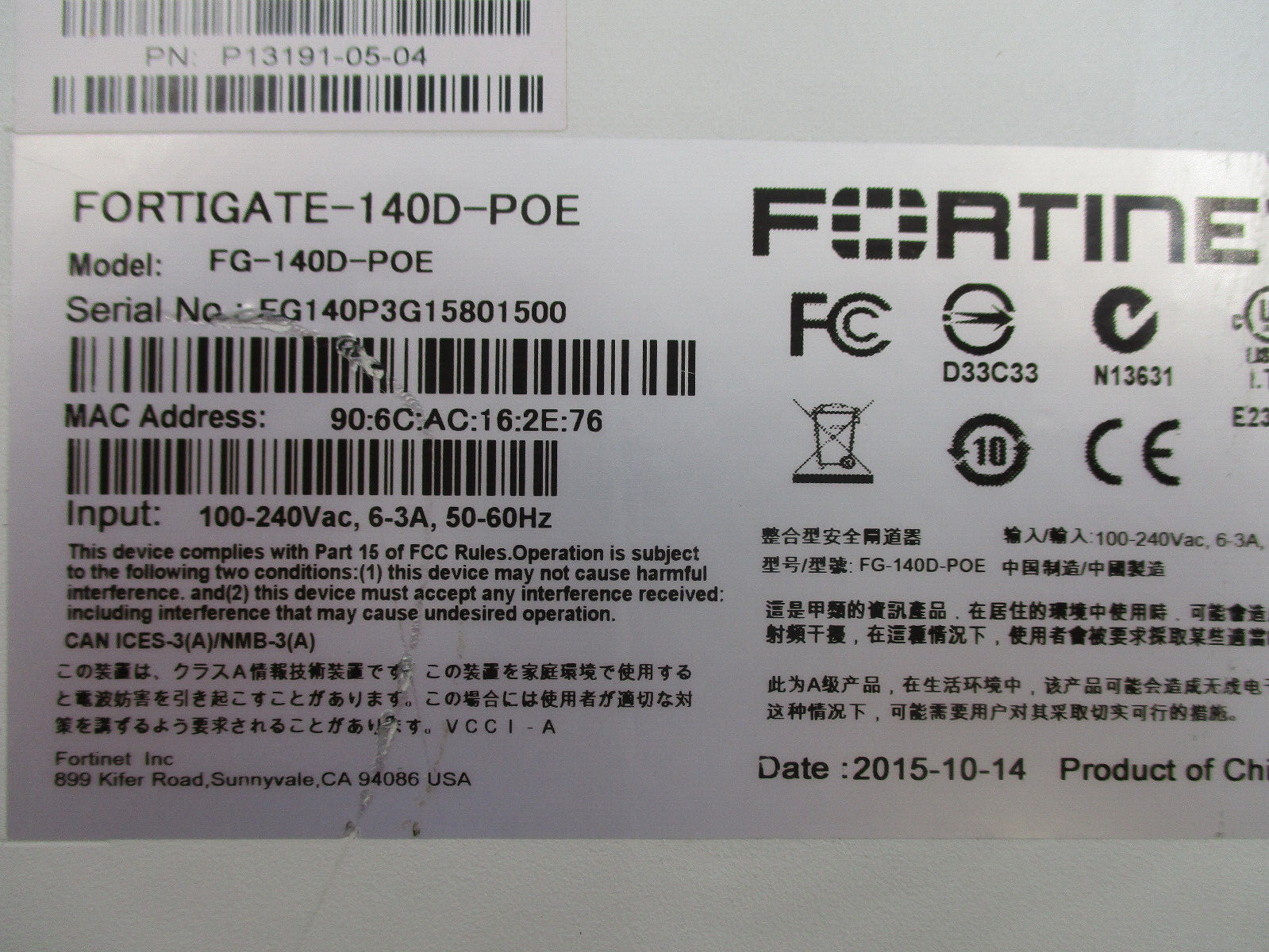 Fortinet FortiGate FG-140D Firewall Network Security Appliance P/N: P13191-05-04