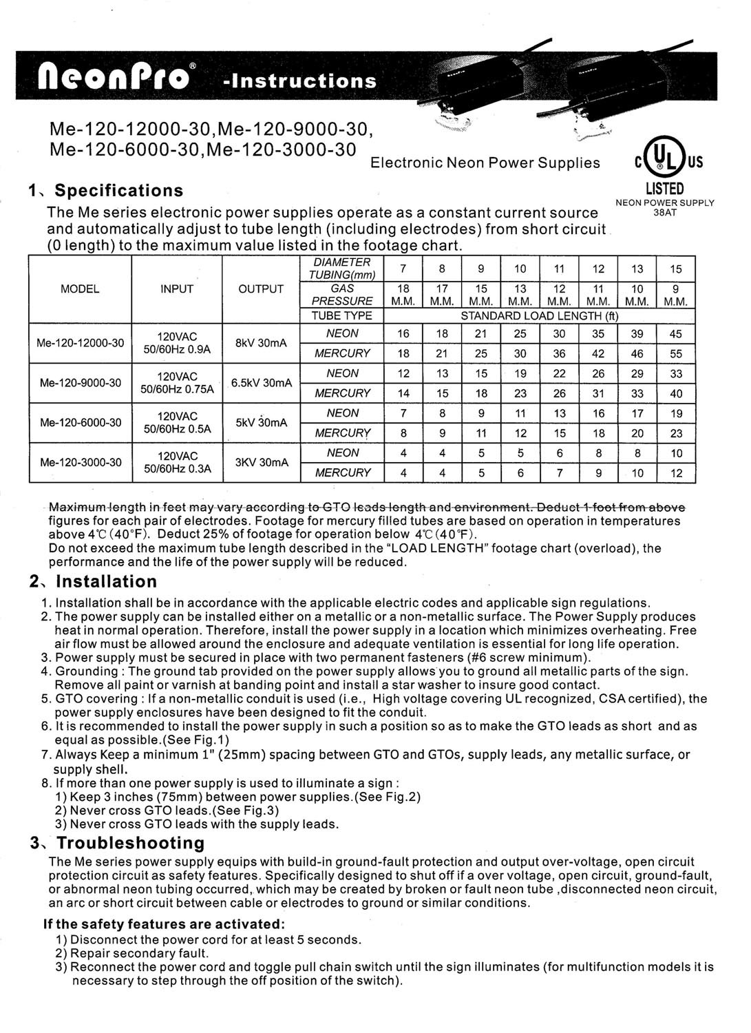 UL Listed 7,500 volts / 7.5kV 6.5kV RMS NEON SIGN TRANSFORMER POWER SUPPLY