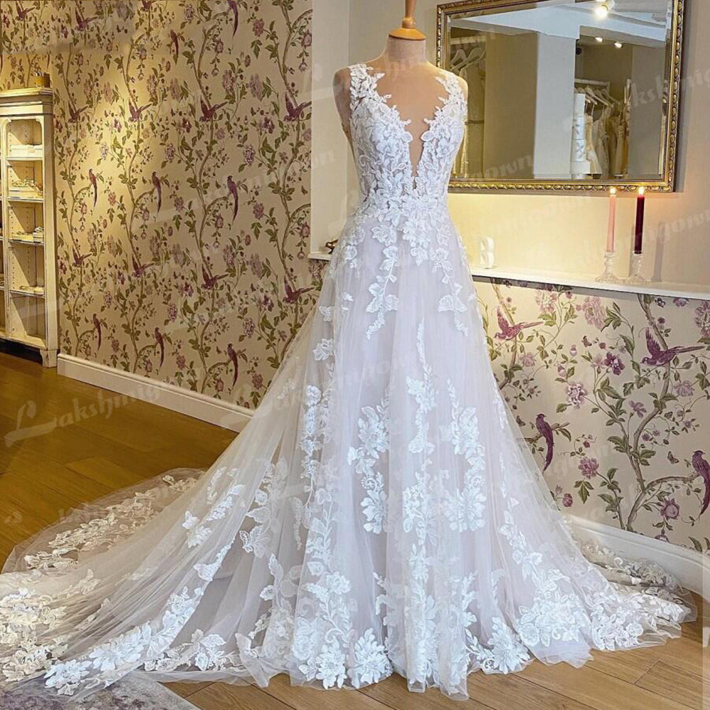 V Neck Beach Wedding Dresses Lace Appliques Backless Bridal Gowns Court Train