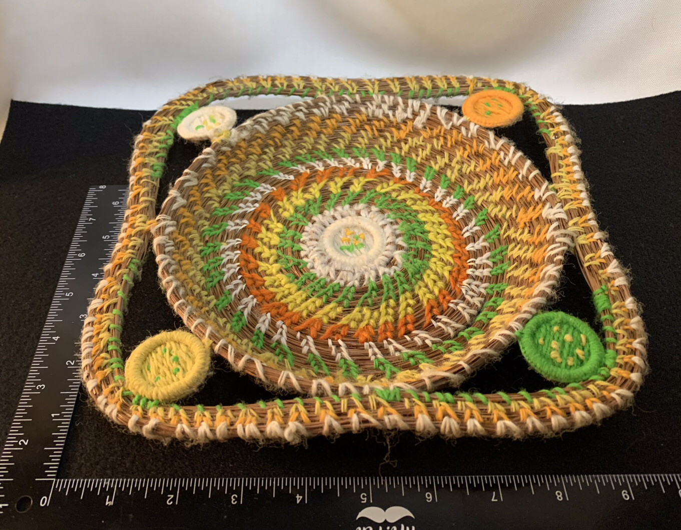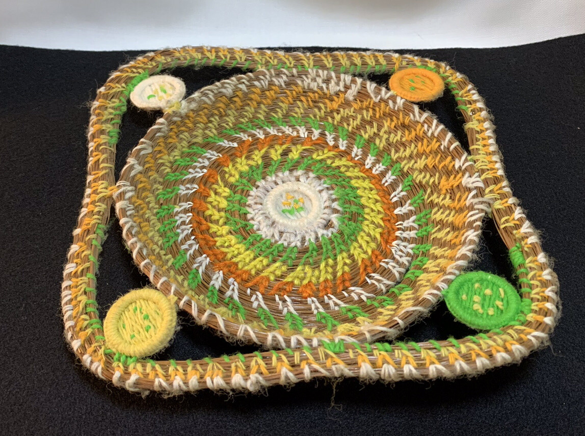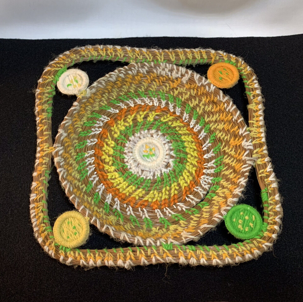 Basket Yellow Orange Green Yarn and Pine Needles Round Square 1 High 9 1/4