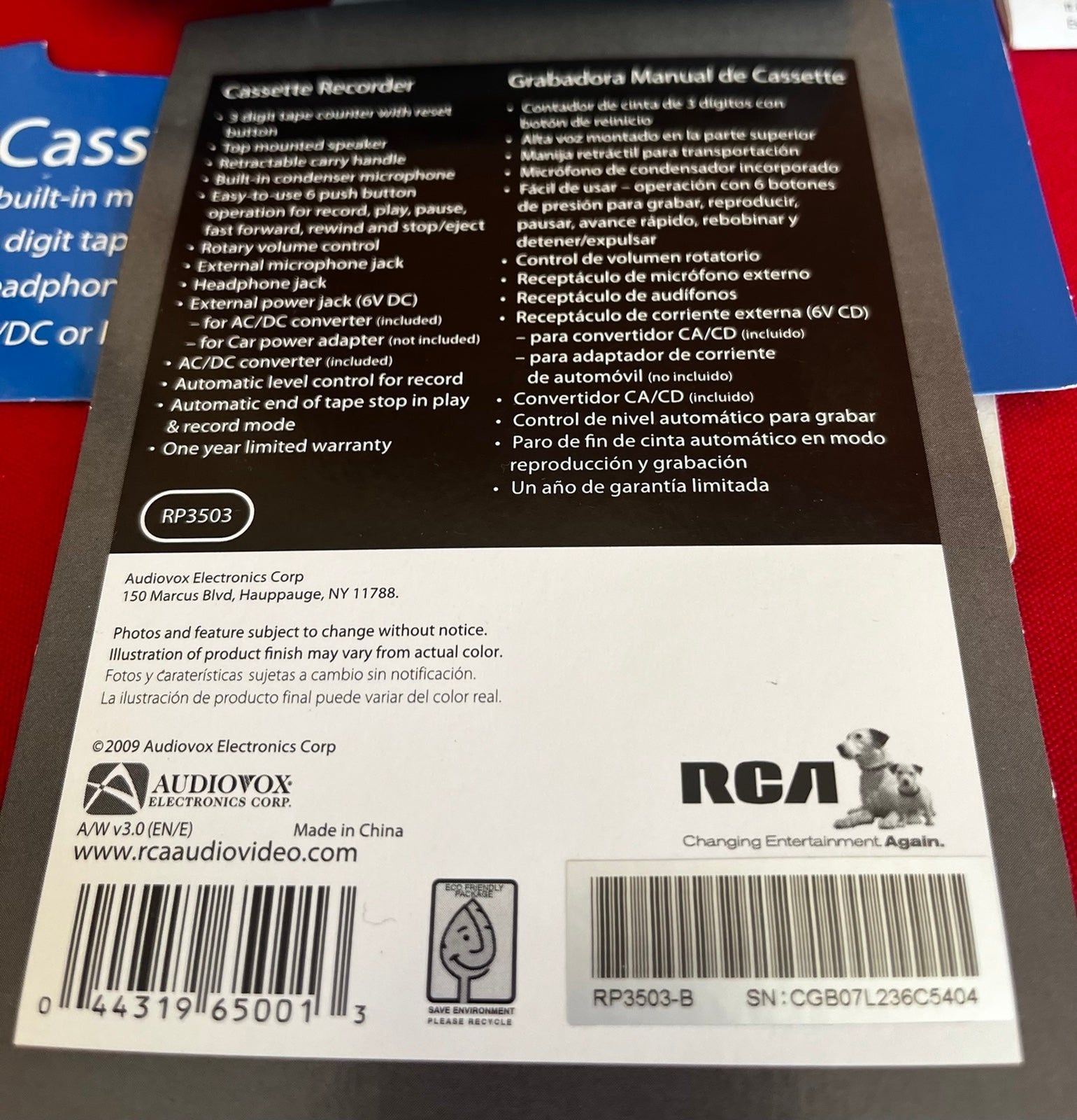 • RCA RP3503 Cassette Recorder with Microphone-plug in or battery. Working order