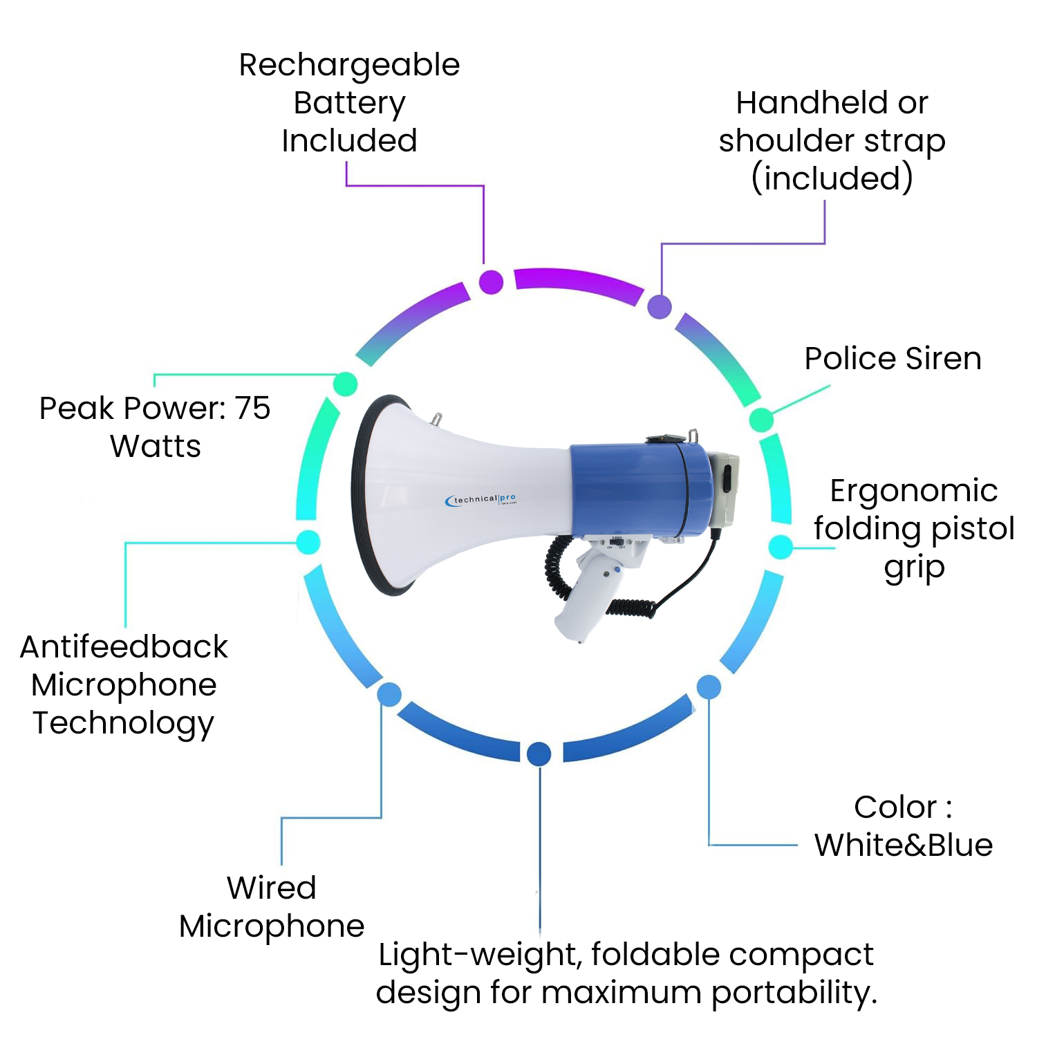 TPro Portable 75W Megaphone Bullhorn Speaker w/Siren ,Microphone Battery
