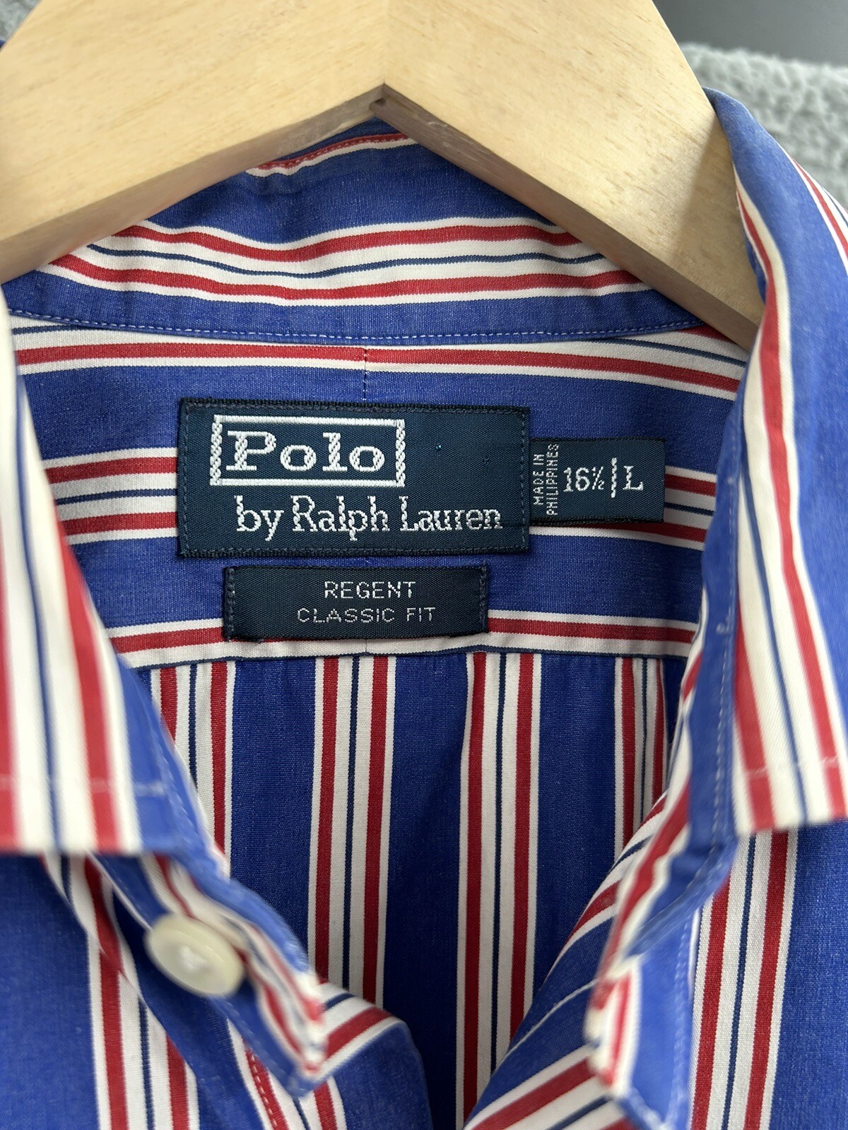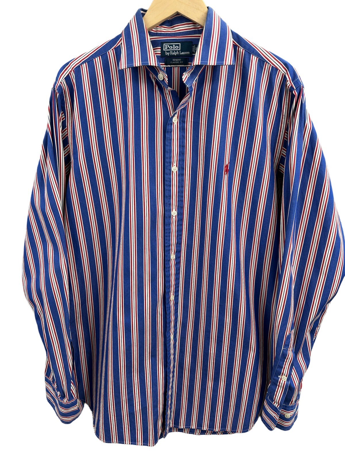 Polo Ralph Lauren Button Up Shirt Regent Classic Fit Blue Red Stripe 16 1/2 Lrg