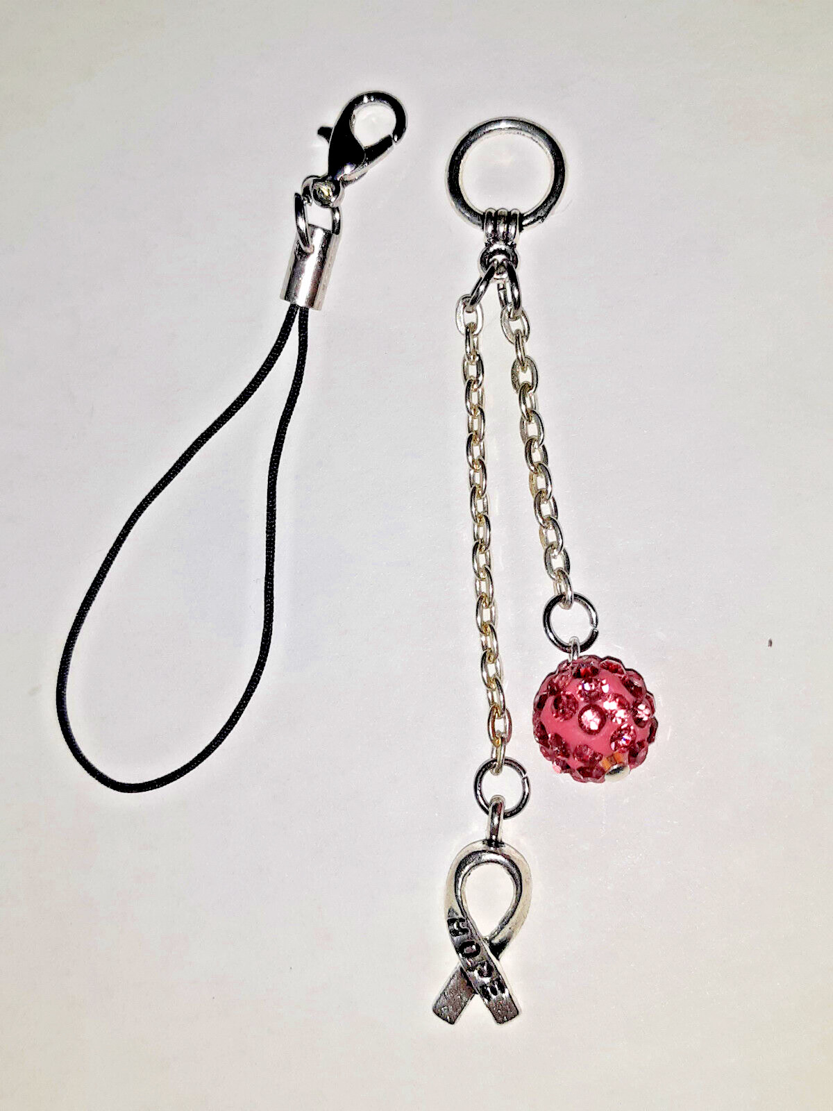 Cell Phone Charm Strap Silver Dangle Pink Crystal Breast Cancer Awareness Ribbon