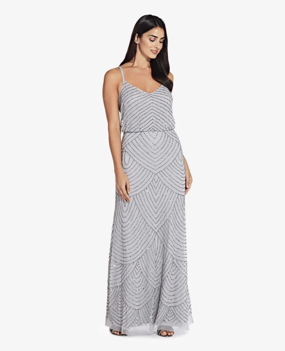 Adrianna Papell Art Deco Beaded Blouson Gown Blue Mist
